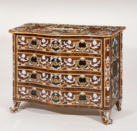 Commode con intarsi in legni rari, decorata in avorio inciso e ornamenti in