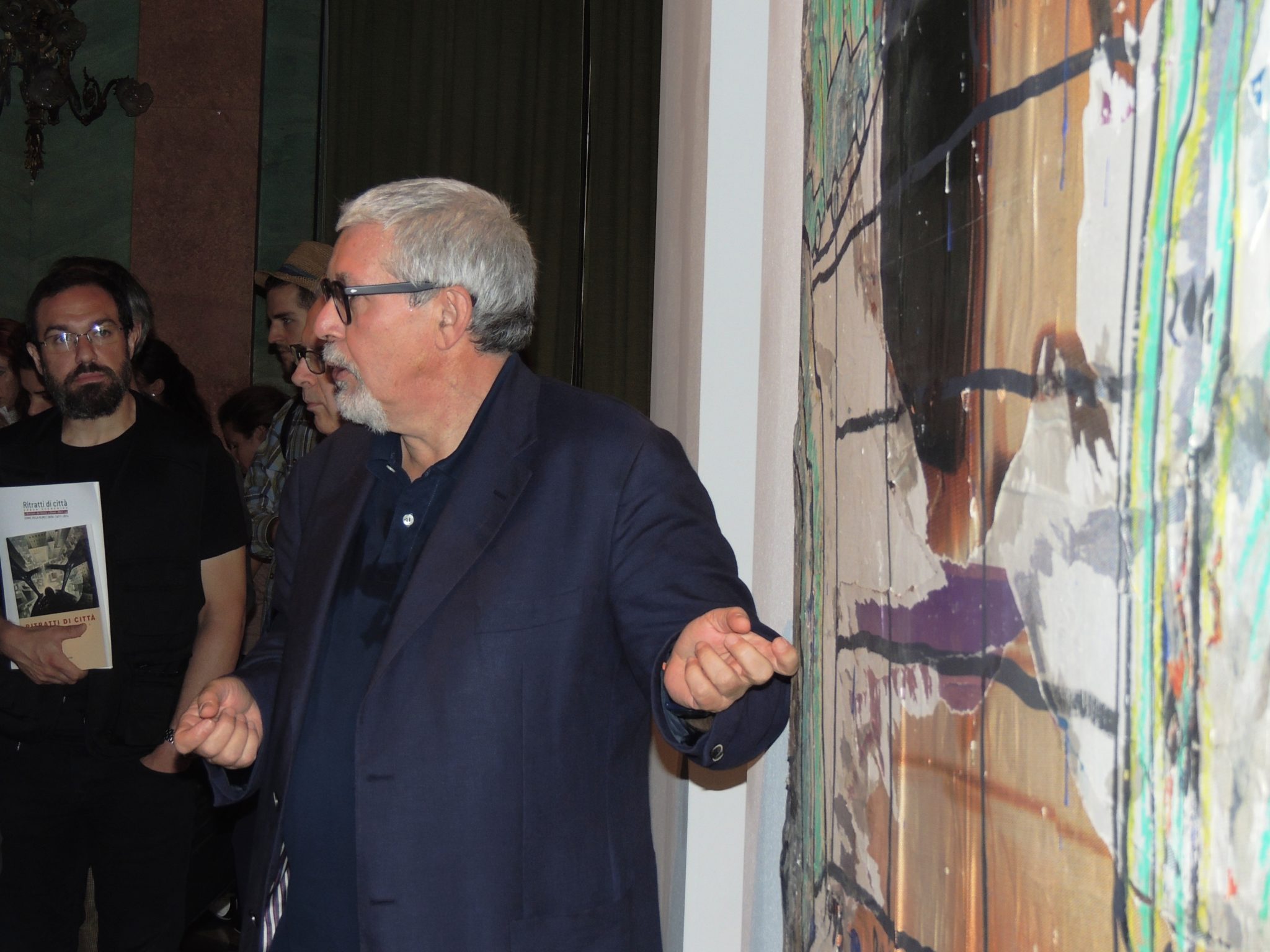 Flaminio Gualdoni davanti a un Mimmo Rotella