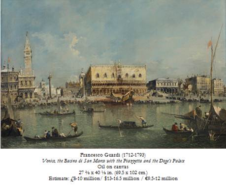 Il top lot da Christie’s all’asta dedicata agli Old Master & British Paintings che si terrà questa sera, martedì 8 Luglio a Londra, parla italiano. Si tratta infatti de Il Bacino di San Marco con la Piazzetta e il Palazzo del Doge, una veduta veneziana di Francesco Guardi (1712-1793) proveniente dalla Collezione del Barone Henri de Rothschild e stimata £8-10 milioni.