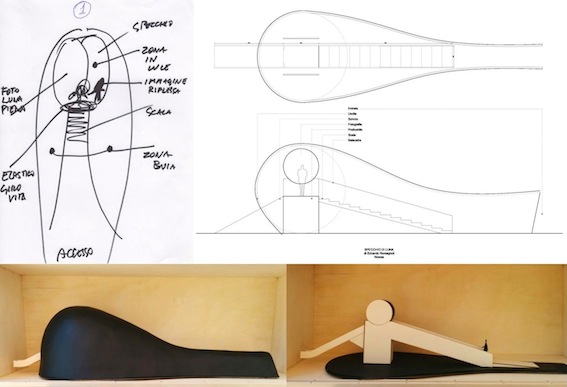 Ho creato due progetti per cercare di ricreare a chi vuole partecipare, un assaggio di emozione di quello che potrebbe essere andare sulla luna. Quello esposto da Sabrina Raffaghello a Milano è un modellino, realizzato da un giovane architetto che nella struttura finale dovrebbe essere di 16 metri. Si compone di un corridoio d’ingresso buio con una rampa dove si sale fino ad arrivare a un piccolo ripiano e lì, a sinistra, c’è una foto della luna piena di due metri di diametro e la vorrei retroilluminata e quindi luminosa. Sulla destra invece c’è uno specchio di due metri di diametro. E il visitatore, se guarda a sinistra, vede la luna piena e se guarda a destra, vede se stesso sulla luna piena. Il titolo è Specchio di luna. E, per tornare sulla terra e abbandonare la luna, ho pensato a uno scivolo.