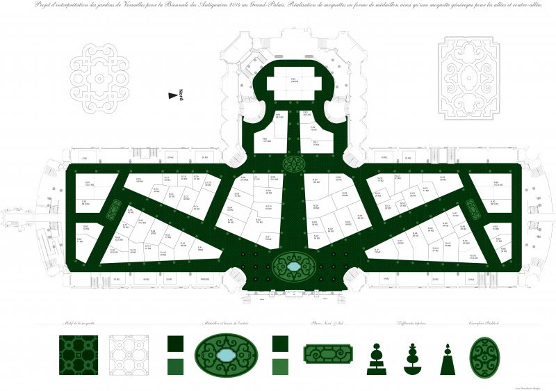 A richiamare il celebre Bassin de Latone di Versailles sarà una fontana di oltre 40 mq che accoglierà i visitatori del Grand Palais. Lo spettacolare scenario prevede inoltre 400 fra alberi e cespugli scolpiti in giganteschi vasi medicei ispirati all’arte topiaria della reggia alle porte di Parigi con 75 panche in pietra che riprendono perfettamente gli originali. Per scherzare sulla complessità dell’opera Jacques Grange ha anche calcolato in 1 miliardo i chiodi che verranno utilizzati nel cantiere.