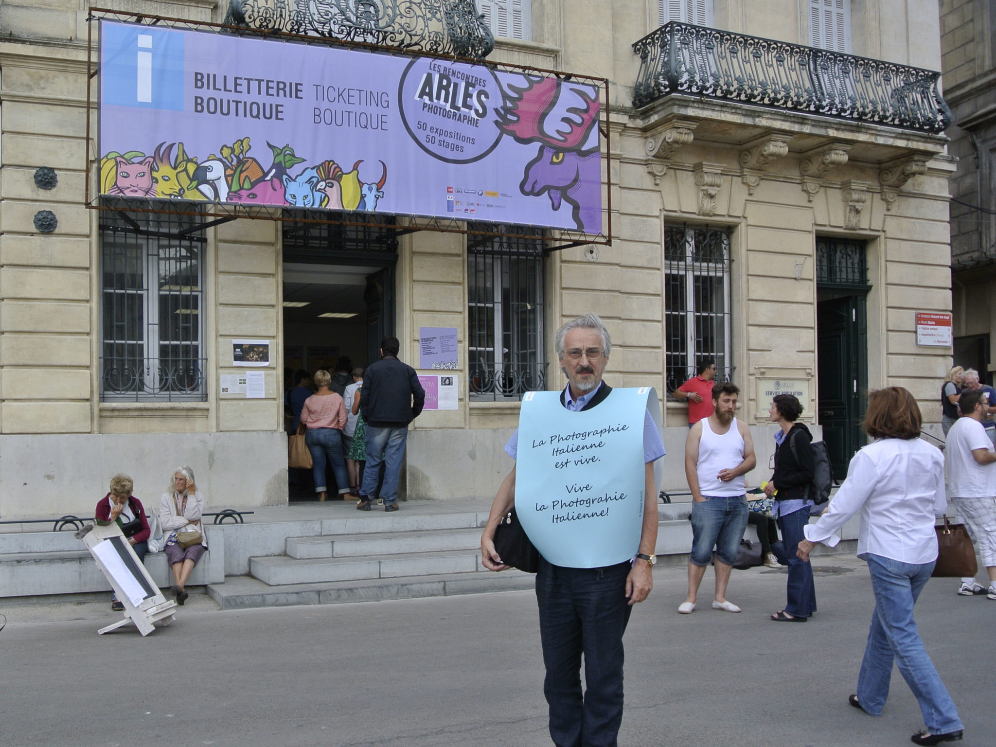 In questa edizione, e non è la prima volta, non vi è presenza di italiani, come a decretare l’inesistenza della Fotografia Italiana. Un fotografo italiano però ha circolato, tra il 10 e il 12 luglio, in lungo e in largo per Arles. Questo italiano, sdegnato dall’inerzia degli operatori istituzionali del Bel Paese, dall’alto del suo metro e ottanta, occhialini, capelli bianchi e pizzetto, ha indossato un poncho, La Photographie Italienne est viveVive la Photographie Italienne, in segno di protesta.