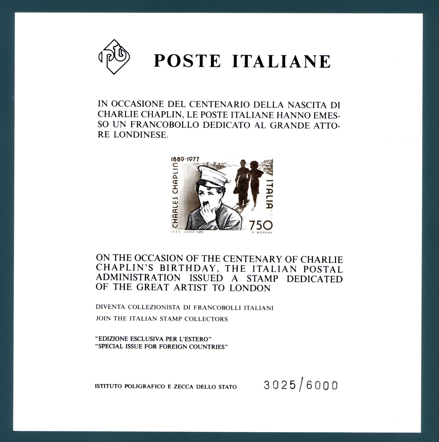 Le annate complete delle emissioni italiane del 1989, e solo quelle vendute all’estero, comprendevano anche un foglietto pubblicitario (il secondo emesso in epoca repubblicana) tirato solo in 6.000 esemplari numerati. Dedicato al centenario della nascita di Charlie Chaplin, raffigura lo stesso francobollo emesso per l’occasione ma in versione non dentellata. La sua quotazione sull’Unificato, ogni anno in lenta ascesa, è ora a 590 euro. Finora gli album filatelici non hanno dedicato una casella apposita a questo foglietto.