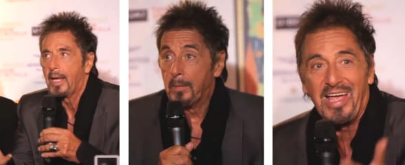 Nel corso della conferenza stampa organizzata oggi al Lido, Al Pacino si è mostrato come sempre simpatico e intrigante, riconfermando il profondo rapporto che lo lega all’Italia e a Venezia e dispiacendosi di non aver ancora imparato l’italiano, nonostante lui si senta un italiano.