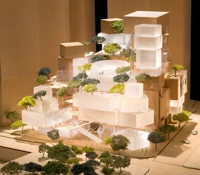 Nel 2013 la palla è poi passata a Frank O’ Gehry, il cui prospetto prevedeva una serie di volumi rettangolari, disposti a cascata e arricchiti di verde.