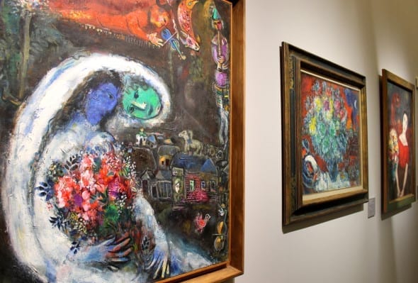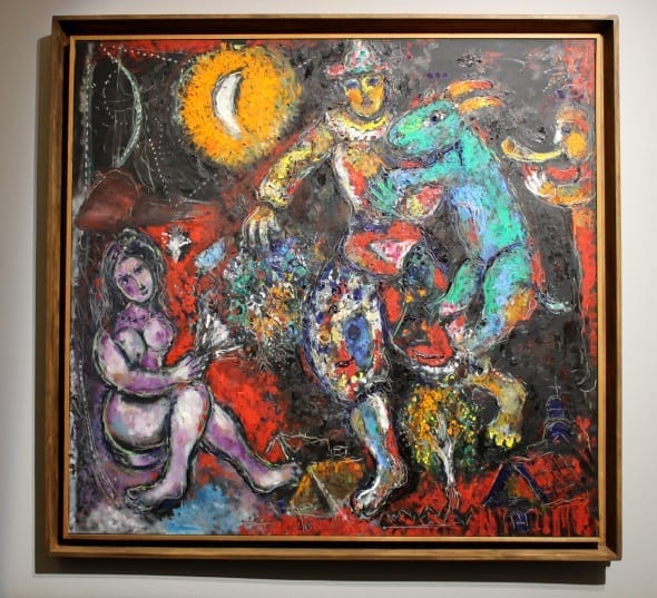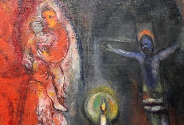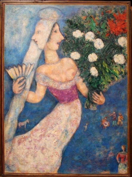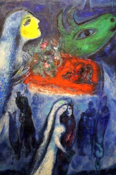 “Una retrospettiva“, come recita umilmente il titolo, che raccoglie cronologicamente il linguaggio onirico surreale di Chagall, artista sognatore e visionario che ha saputo raccontare il mondo con i toni di una favola. “Ebreo errante in preghiera”, partito da Vitebsk, arrivato in Provenza passando per mezza Europa e l’America, capace di miscelare le tre culture cui appartiene, ebraica, russa e occidentale, in un’unica poetica artistica universale dove i riti della tradizione ebraica si sposano con la modernità delle “avanguardie” dei caffè parigini.