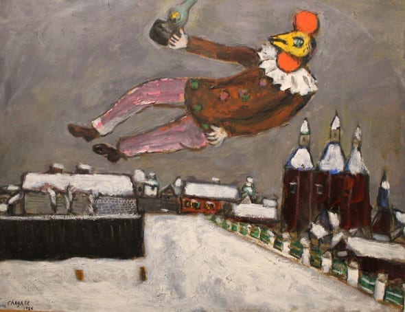 Rabbini volanti, polli fluttuanti, mucche con l’ombrello, asini alati blu, capre verdi e galli gialli con ali da arcangelo che svolazzano per le strade di Milano assieme a lampioni a passeggio? Tutto vero! Chagall è a Palazzo Reale con i suoi amanti sospesi “come soffi dell’anima” nei cieli nevosi di Russia in copertina e “solo” altre 220 opere per tutto autunno, inverno, fino al primo febbraio 2015.