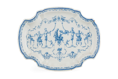 PIATTO DI SERVIZIO IN MAIOLICA BIANCA E BLU, MOUSTIERS, PRIMA META’ XVIII SECOLO. Lung. cm 54,2