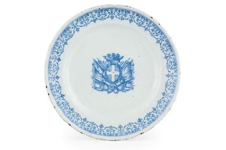 Da una collezione privata piemontese, proviene una serie di maioliche prodotte a Torino a partire dalla prima metà del Settecento (Rossetti e Ardizzone), con esemplari anche araldici di grandi dimensioni, molti decori ‘alla Bérain’ di impronta francese in bianco e blu e una affascinante serie di quei decori a figure (per lo più di impianto rocaille) che costituiscono una delle glorie dei maiolicari sabaudi. Un esempio ci viene da una alzata in maiolica bianca e blu, forse G.B. Rossetti presso Rampini, Pavia, circa 1730 (stima 1.200 – 1.600 euro); da un piatto di servizio in maiolica policroma, probabilmente manifattura Ardizzone, seconda metà XVIII secolo, dalla forma mossa e decoro al centro con scena di porto (stima 800-1.200 euro): infine, da un piatto di servizio in maiolica bianca e blu, Moustier, prima metà del XVIII secolo, con decoro ‘alla Bérain’ (stima 1.800 – 2.200 euro).