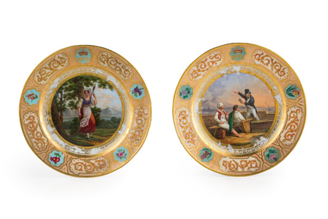 Per le porcellane ricorderemo infine, sempre di Doccia, il numeroso vasellame databile al primo e al secondo periodo di produzione; un bel nucleo di porcellane ottocentesche di Jacob Petit, come ad esempio, una coppia di tulipaniere in porcellana policroma, Parigi, Fontainebleau, circa 1840, di gusto neo-rocaille e decoro floreale parzialmente a rilievo su fondo nero (stima 300–500 euro), e di manifatture che alla sua attività s’ispiravano; un grande gruppo in biscuit della parigina Nast del 1810, raffigurante Apollo Citaredo fra le Arti (in serie con alcuni esemplari oggi conservati nelle Civiche Raccolte piemontesi, stima 800-1.200 euro), ed infine, una rara serie di piatti a figure del Regno legati alla committenza delle regina Cristina di Spagna di Borbone a Napoli del 1830 (stima 900-1.200 euro).
