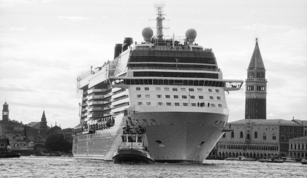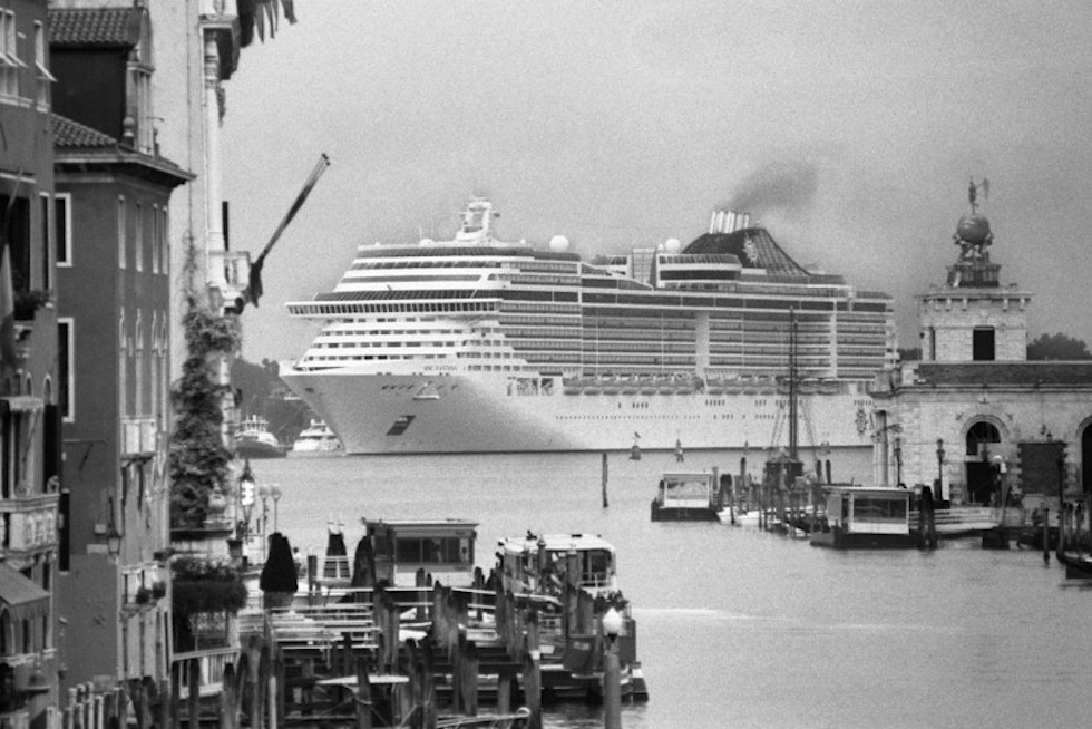 “Immortalare” i mostri per poi “distruggerli”. Il nuovo lavoro di Berengo Gardin a Villa Necchi Campiglio (MI) (ora Negozio Olivetti, Venezia ndr) è un atto di amore e denuncia alla “sua” Venezia. Bella addormentata nel suo incanto e violata quotidianamente dalle flotte di Kraken che vagano indisturbate per la Giudecca. 27 scatti “terra-nave” senza didascalia (basta e avanza lo schifo che sono e rappresentano) sparati con il suo “cannone” da campi e campielli contro i barbari galleggianti. Invasori.