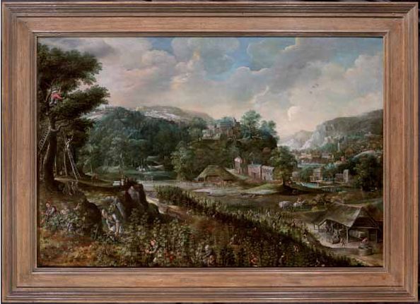 Paesaggio autunnale con vendemmia e raccolta di frutti