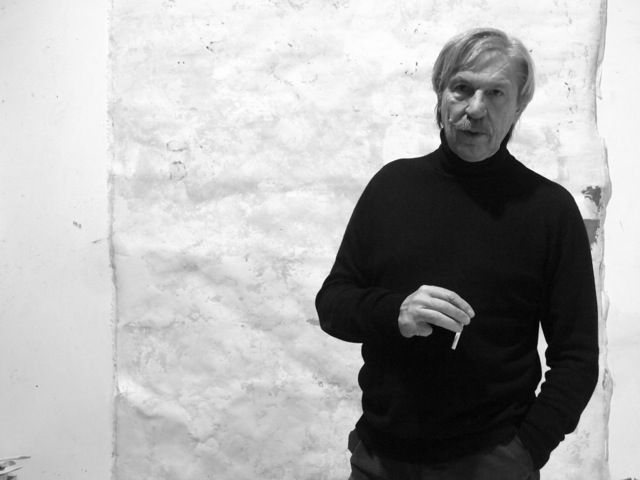 Franco Guerzoni è nato nel 1948 a Modena. All’inizio degli anni settanta utilizza la fotografia come strumento di rappresentazione, del 1972 sono i suoi “Affreschi”, del ’73 le sue ”Archeologie” seguite dalle “Antropologie”, ricerca legata agli aspetti della stratificazione culturale e all’idea di “antico” come perdita. Negli anni ottanta è impegnato nella realizzazione di grandi carte parietali che indagano l’idea di una geografia immaginaria, “Carte di viaggio”, “Grotteschi” e “La parete dimenticata”, alla fine degli stessi anni lavora sulla superficie intesa come profondità. Presenta “Decorazioni e rovine” in una sala personale alla Biennale di Venezia del 1990. Da allora continua, attraverso grandi cicli di opere, la sua indagine sul tempo e sulla poetica della rovina, una sorta di archeologia senza restauro. Dal 2006, in seguito al disoccultamento di un corpo di lavori realizzati con l’uso del mezzo fotografico dall’autore negli anni settanta, presenta alla GAM di Torino “Paesaggi in polvere”, da allora alle sue ricerche si affianca una vera e propria attività di ricongiunzione o di trasferimento che va dal dipinto alla parete vera e propria, inseguendo il sogno che congiunge i tentativi precedenti rivolti alla creazione di una sorta di bassorilievo, costante in tutto il suo lavoro, verso una idea di scultura lieve figlia della nuova attenzione al muro. Quindi la “Parete dimenticata” diviene la reale sede privilegiata del suo più attuale lavoro.