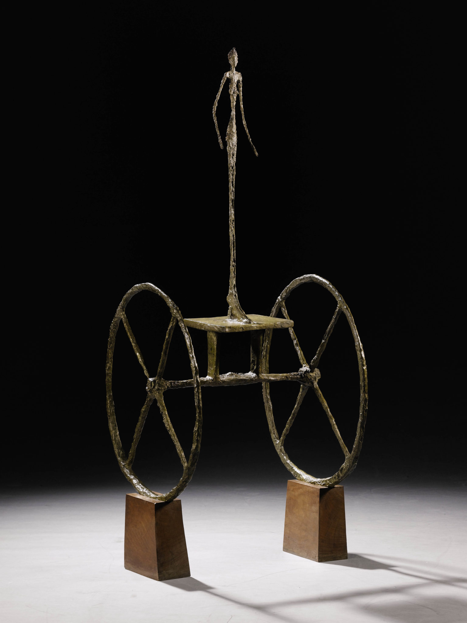 Property of a Distinguished Private Collector Alberto Giacometti Chariot Inscribed with the signature A. Giacometti, with foundry mark Alexis Rudier Fondeur Paris and numbered 2/6 Painted bronze on wooden base Height: 57 in.; 144.7 cm Conceived in 1950 and cast in 1951-52 Estimate in excess of $100 million
