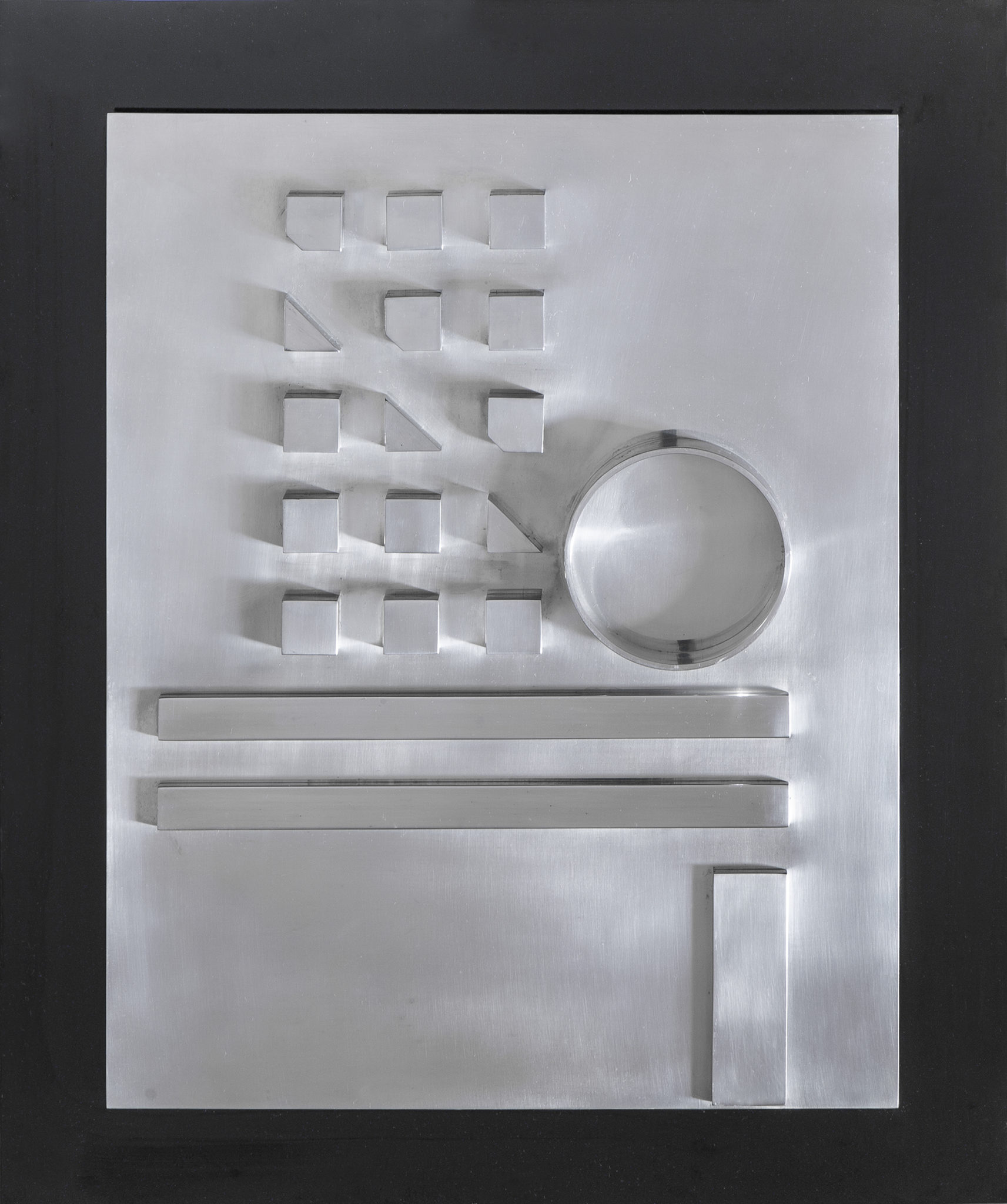 I “Rilievi” sono opere plastiche, inedite per il mercato attuale, di forte impronta costruttivista e ispirate all’arte programmata, sono altorilievi monocromi realizzati in legno o in lega di alluminio (anticoral); la sua prima opera è datata 1953, seguono una serie di tele e disegni sui quali utilizza l’aerografo, forse come campo sperimentale per giungere alla realizzazione delle forme scultoree.