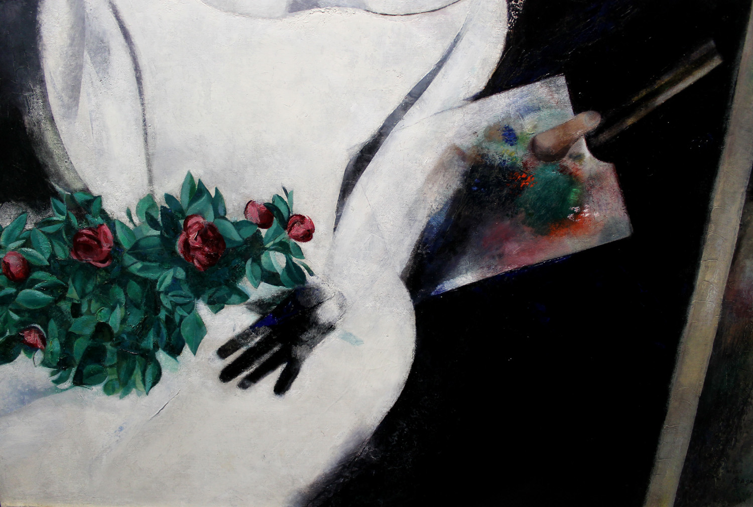 Nel 1924 Chagal dipinge il “Doppio ritratto” in cui appaiono lui e la moglie con un mazzo di fiori tra le mani: l’intimità dei ritratti precedenti è superata da un più evidente rapporto con la realtà esterna del mondo, nel dinamismo dei corpi e nella modernità dello stile. La composizione rispecchia infatti il clima culturale degli anni Venti, anche nell’abito e negli accessori di Bella.