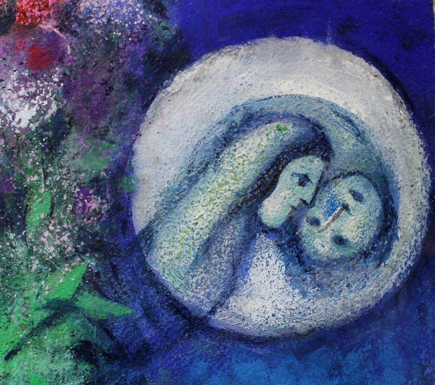 Durante i felici anni del loro fidanzamento, Chagall avvia il ciclo di dipinti dedicati all’amore che come rivelazione poetica. Ne “Gli amanti in blu” (1914) Marc e Bella sono viso a viso, immortalati in un attimo in cui gli individui si fanno archetipi, in cui sentimento e sogno si fondono.