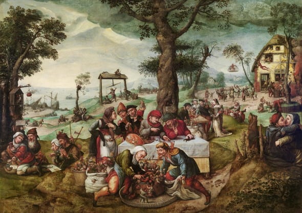 “In un ampio paesaggio con prati verdi, sotto un grande albero, alcuni mercanti commerciano e fanno affari con tanti piccoli uomini, riconoscibili per i loro cappelli come gli sciocchi. Questa scena può essere considerata solo come un’allegoria e illustra quel tipo di follia umana sempre presente, una vera e propria satira sulla follia umana.
