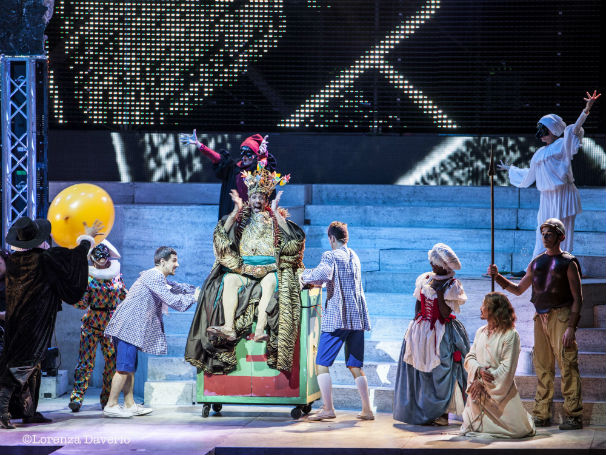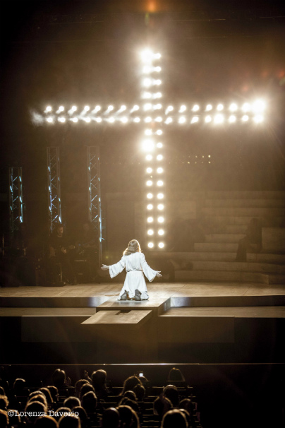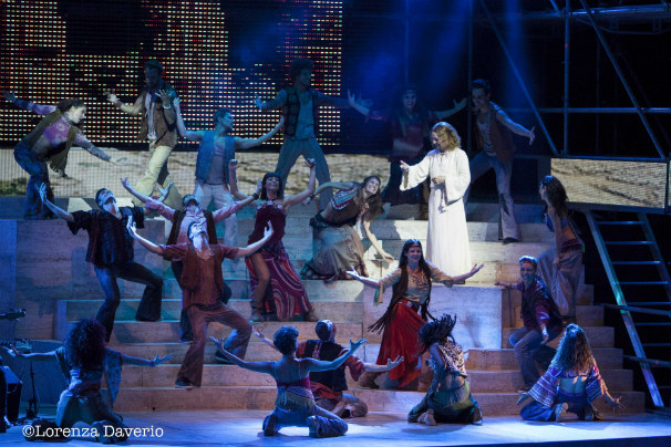 La scenografia, di Giancarlo Muselli elaborata da Teresa Caruso, è tanto semplice ed essenziale da essere di grande impatto: un’impalcatura percorre tutto il perimetro del palcoscenico e una pedana rotante incorniciata da un colonnato in rovina svela, a seconda delle scene, una parte dell’orchestra, composta in totale da 12 elementi. Sul palcoscenico si muove, con le coreografie di Roberto Croce, un ensemble di 24 acrobati, trampolieri, mangiafuoco e ballerini che danno vita a scene cariche di entusiasmo, comunicando al meglio il fervore intorno al messaggio così umano e vero del Cristo.