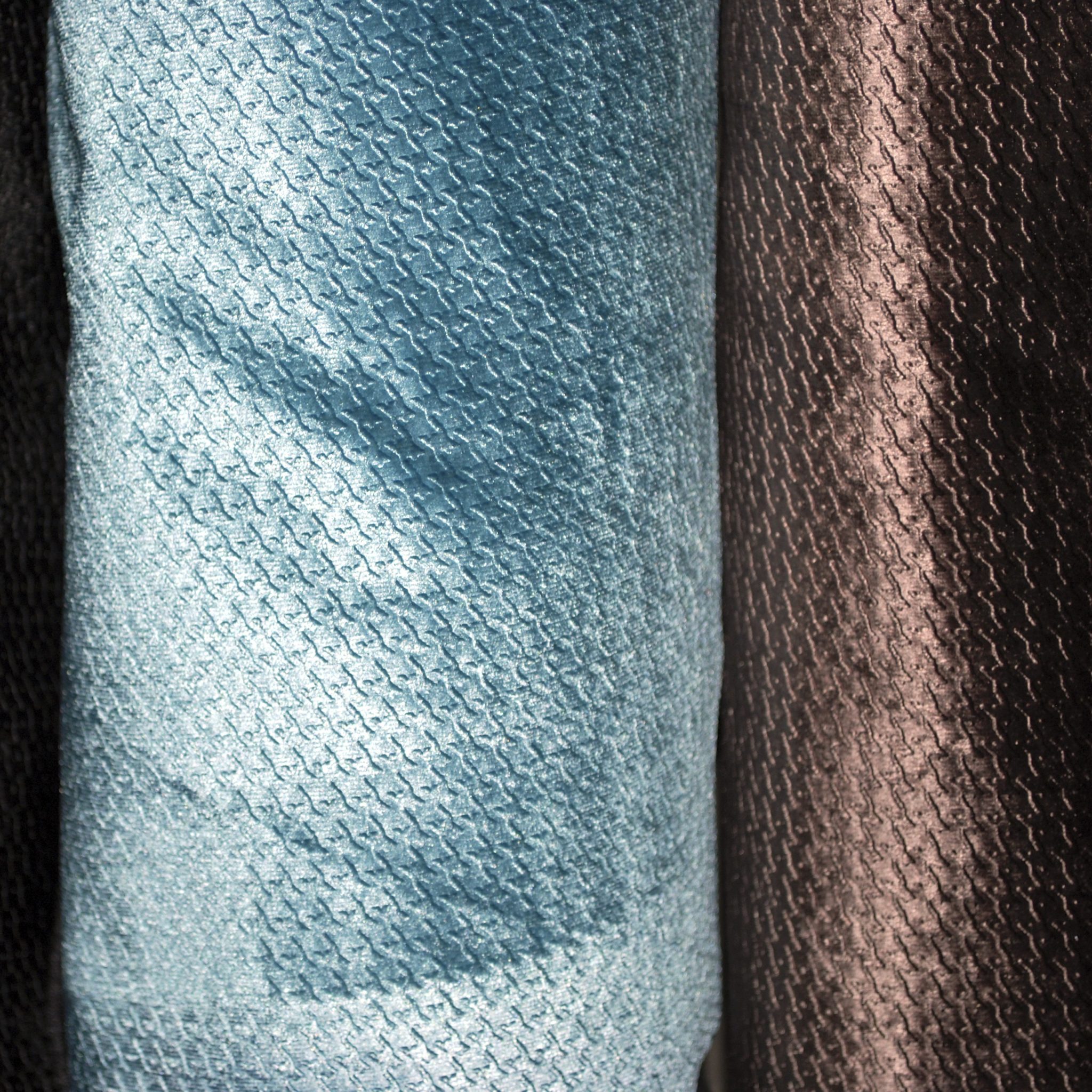 Ad ogni nuova collezione propone lavorazioni a rilievo, ricami e accoppiamenti in tutte le possibili gamme di colore su tulle, lana, raso, glitter, seta, cotone, velluto, neoprene, pvc, damasco, fustagno, lino, feltro, microfibra, canvas, lurex rete ed altro ancora.