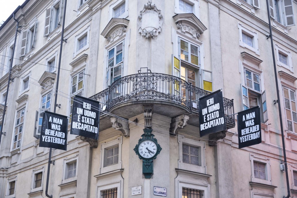 “Ieri un uomo è stato decapitato” sventolava a caratteri cubitali su stendardi neri appesi sugli aristocratici balconi di Palazzo Cavour. E chi poteva essere se non Maurizio Cattelan l’autore della sventolio-performance provocatoria nel cuore di Torino per inaugurare la sua nuova mostra che aprirà il 6 novembre in occasione della Settimana dell’Arte Torinese. A Palazzo Cavour infatti in concomitanza con Artissima sta per inaugurarsi l’esposizione “Shit & Die“: “una lettura dissacrante della morte e del paradosso della vita”. Per promuoverla Cattelan ha bloccato la via antistante per un pomeriggio improvvisando uno show con passanti e giornalisti presenti.