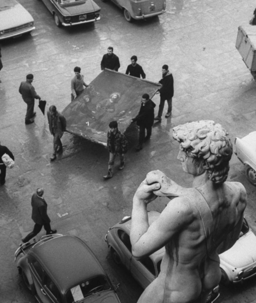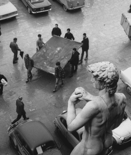 L’Arno straripò trascinando via con sé la vita di 35 persone, 17 fiorentini e 18 cittadini della provincia. L’acqua raggiunse il livello più alto mai registrato, come oggi ricordano le targhe affisse, lasciando la Culla del Rinascimento intrappolata nel fango. Da tutta Italia e dal mondo intero giunsero nel capoluogo fiorentino i cosiddetti “Angeli del Fango” che aiutandosi con badili o a mani nude ripulirono la città dai detriti, salvando vite e opere d’arte.