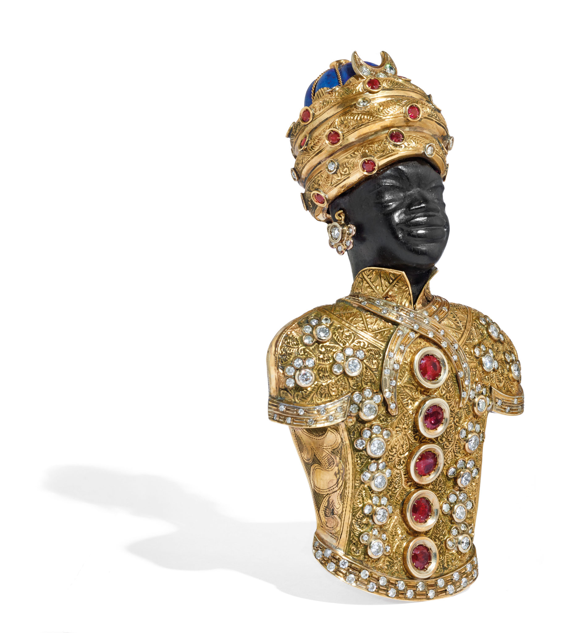 realizzato come un moretto, la testa in ebano, il turbante in lapislazzuli, rubini di taglio circolare e diamanti di taglio brillante, gli orecchini a motivo floreali in diamanti, la veste in rubini di taglio circolare diamanti di taglio brillante, firmata A.Codognato peso gr. 67