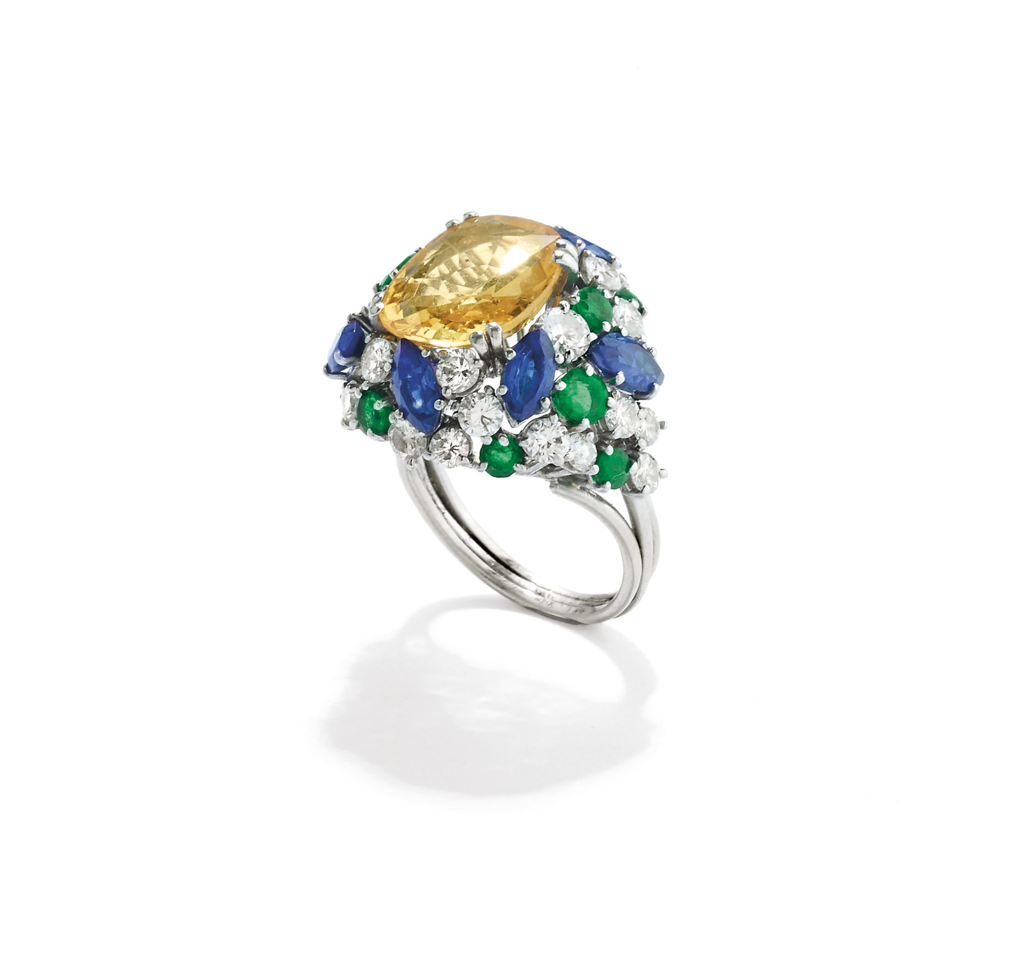 ANELLO IN PLATINO, ZAFFIRO GIALLO, ZAFFIRI, SMERALDI E DIAMANTI, D.WEBB