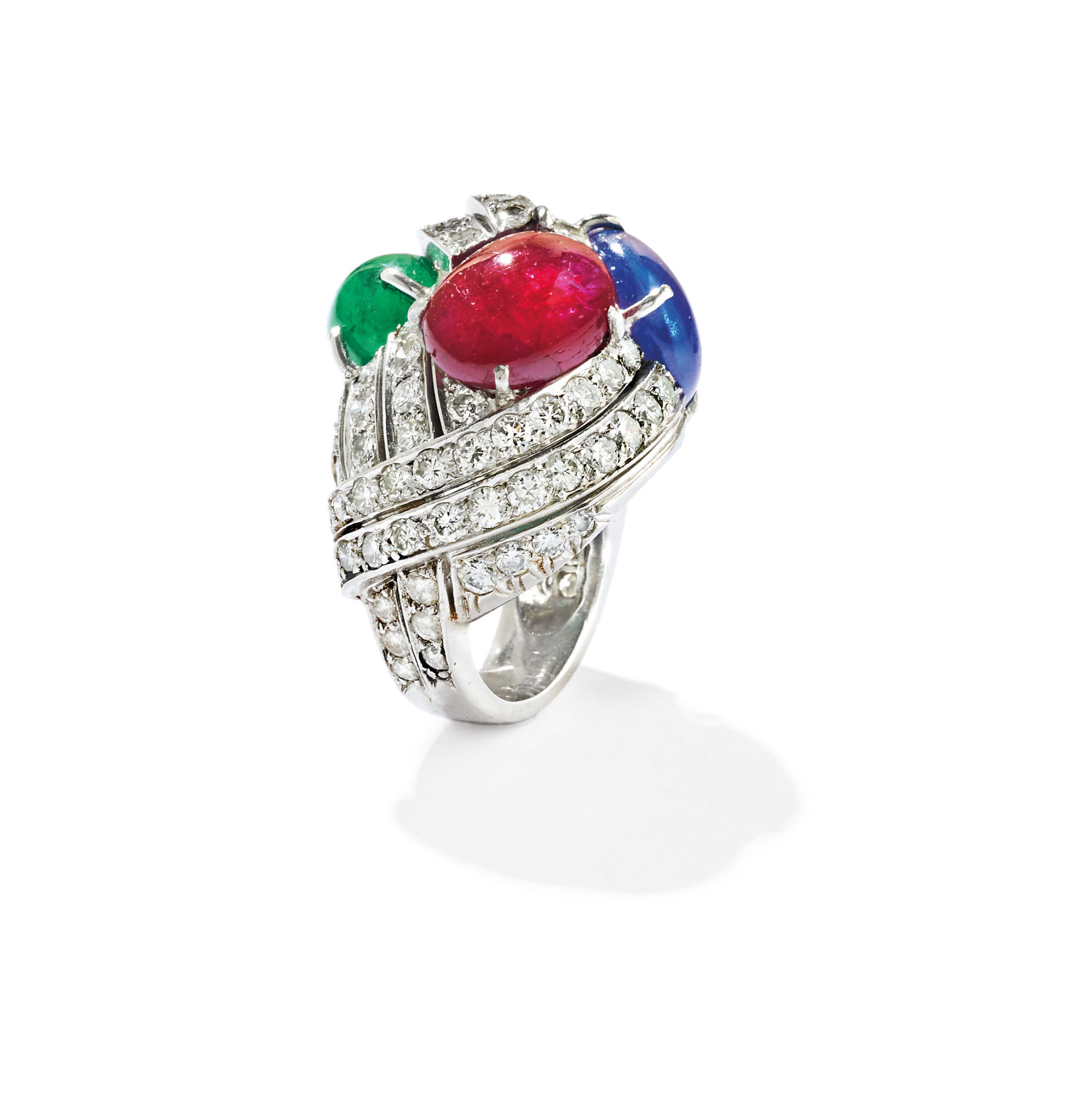 ANELLO IN PLATINO, ZAFFIRO, RUBINO, SMERALDO E DIAMANTI, D.WEBB, 1960 CIRCA a cupola, decorato con zaffiro, rubino, smeraldo cabochon e diamanti di taglio brillante e huit huit, punzone del platino, firmato D. Webb misura 6 1/2, peso gr. 23