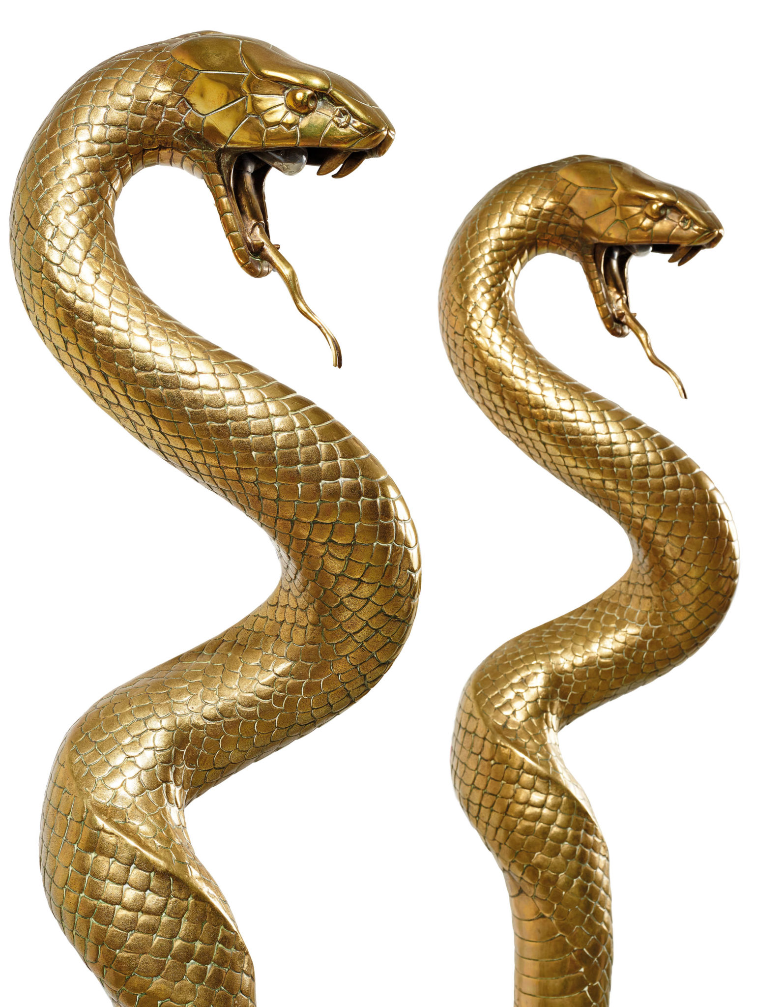 E si guardi al giocoso divano a teatrino in velluto rosso, che sembra riportare alle musiche di un Ponchielli o di un Respighi (Stima € 1.500 – 2.000), o alla coppia di sculture in metallo dorato del XX secolo raffiguranti serpenti con code attorcigliate (Stima € 2.000 – 3.000), perfettamente accoppiati a due imponenti quanto spettacolari letti cinesi del XIX secolo: il primo in legno a lacca rossa con pannelli finemente incisi a rilievo e dorati (Stima € 5.000 – 8.000), il secondo a forma di Takarabune (Barca dei Tesori) in legno a lacca rossa e dorata (Stima € 3.000 – 5.000). Arredo tutt’affatto straordinario, dove la prua coronata da una fenice è realmente un acme d’eclettica ed esotica stravaganza.