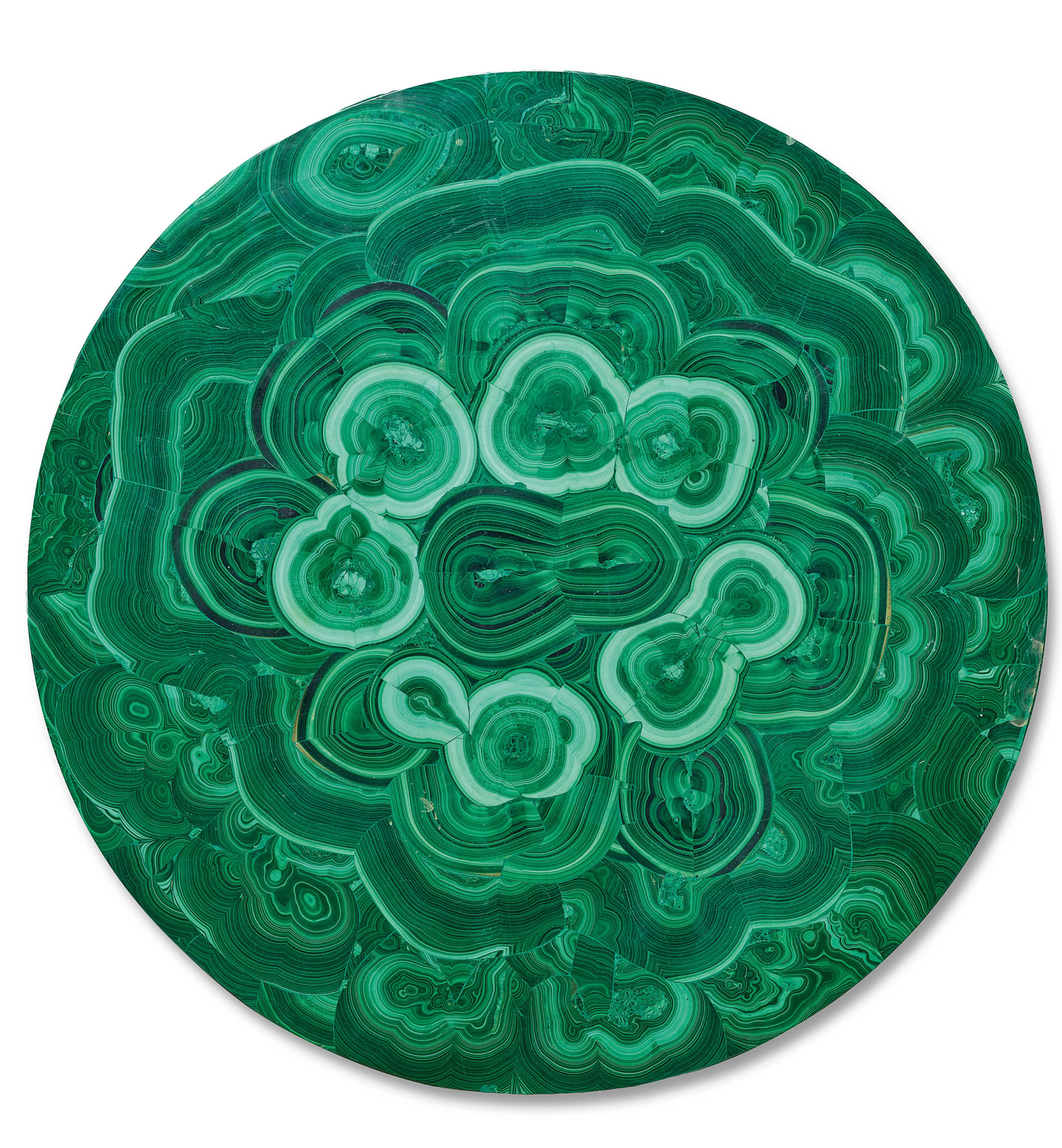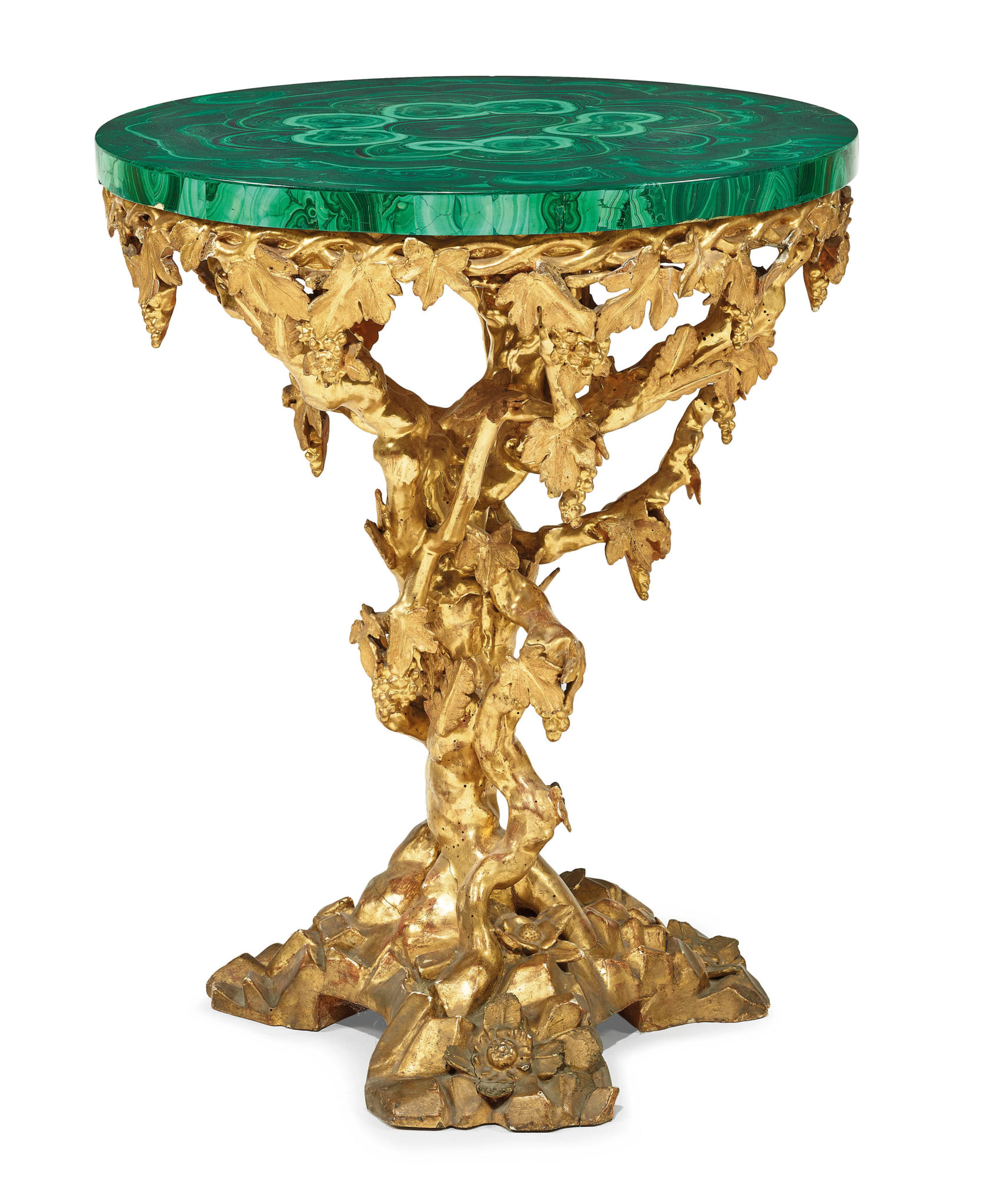 Ad un piccolo tavolo da centro scolpito e dorato del XVIII secolo, di un gusto caratteristico degli ultimi momenti del Barocco, con il piano circolare in marmi policromi a motivi geometrici sorretto da un tronco sul quale si nascondono scoiattoli curiosi (Stima € 5.000 – 8.000), è vicino un altro tavolo di simile impianto: ma qui il piano è in malachite, e l’epoca è il pieno Ottocento (Stima € 4.000 – 6.000).