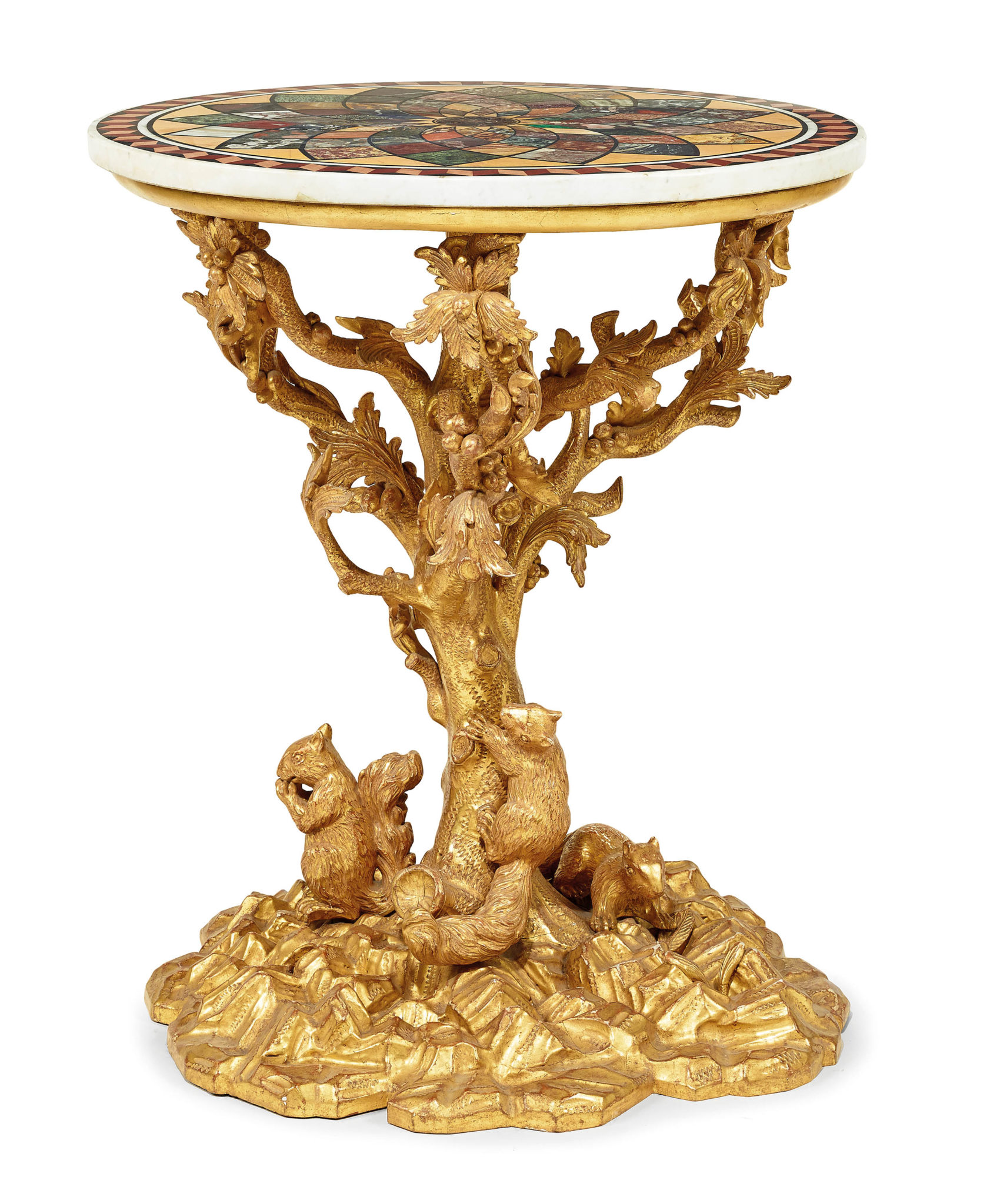 piano circolare in marmi policromi a disegno geometrico, supporto in forma di tronco, arbusti e scoiattoli su base rocciosa; usure, alcune mancanze e restauri nella doratura