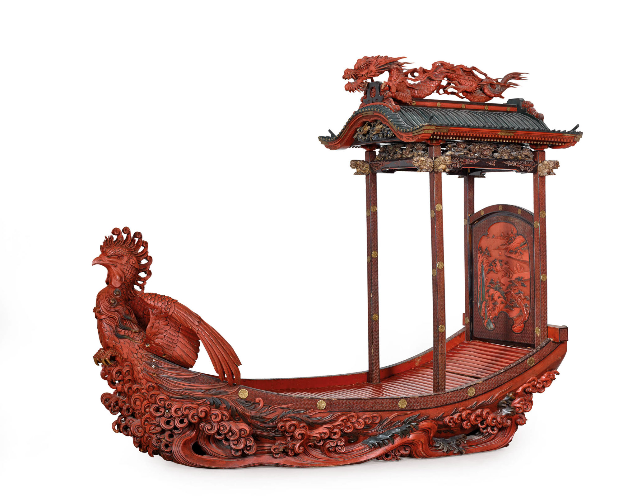 sormontato a prua da figura di fenice a tutto tondo, parte posteriore a pagoda con drago; restauri, rotture, mancanze e sostituzioni. Provenienza: Davies, Londra. Il Takarabune era una barca detta ‘del tesoro’ perche’ destinata a trasportare beni preziosi; a rafforzare la sua importanza nella simbologia Buddhista qui e’ raffigurata con a prua una grande scultura di fenice (simbolo dell’imperatrice) e sulla tettoia, a forma di tetto di pagoda, il drago (simbolo dell’imperatore)