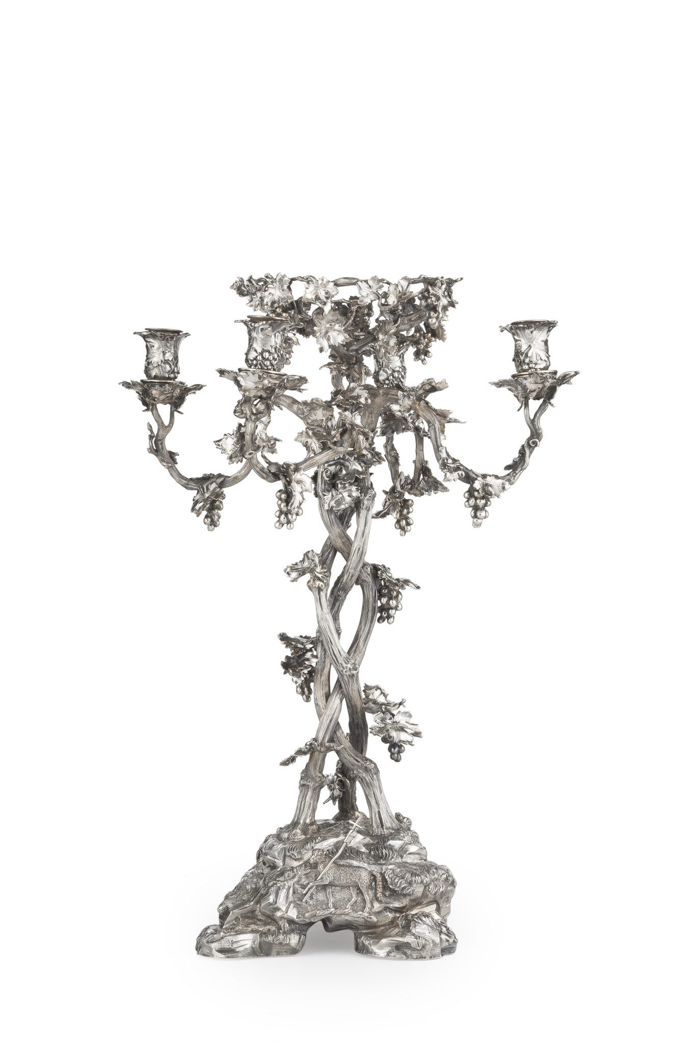Due bellissimi esempi li troviamo in un centrotavola composto da tre candelabri in argento cesellato a Londra nel 1849 da John Samuel Hunt per Hunt & Roskell, successori di Storr & Mortimer, a base triangolare modellata e fusa riproducente delle rocce con la parte in alto degradante da cui si dipartono rami di vite intrecciati che formano l’intera struttura (gr. 14.970 stima € 18.000 – 22.000), e una coeva coppia di rinfrescatoi in argento a base circolare tronconica, nodo lavorato, corpo svasato con bordura a foglie, rami e grappoli d’uva, due manici a trompe l’oeil naturalistici (gr. 4.900 stima € 8.000 – 10.000)