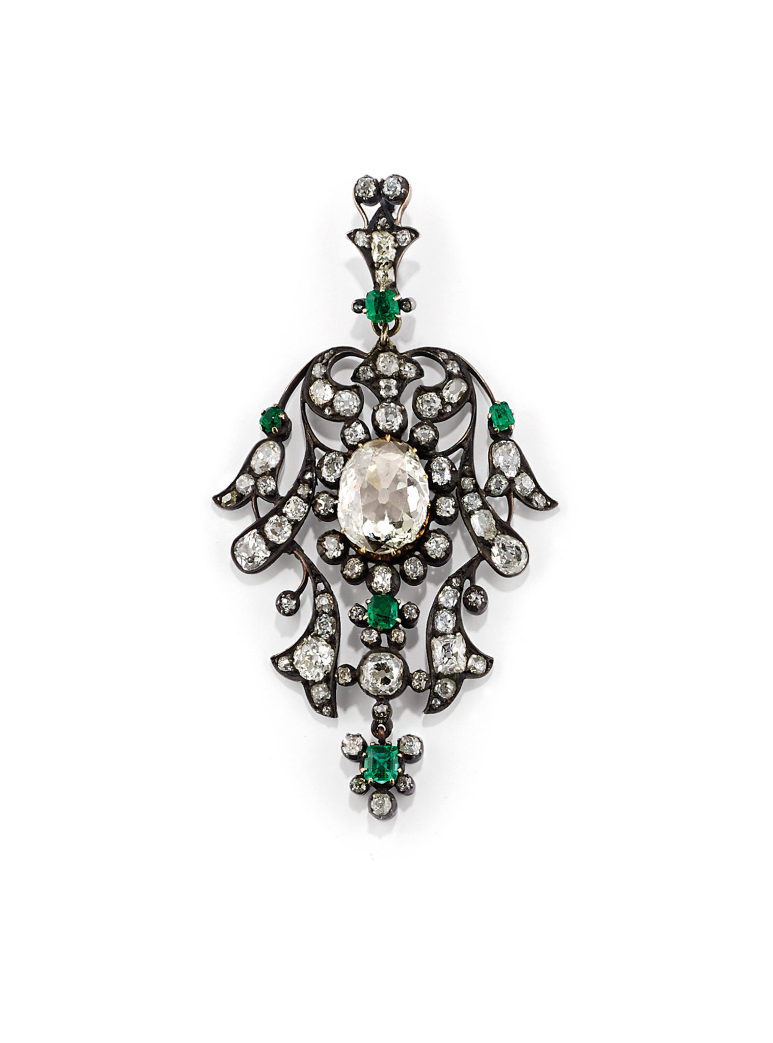 PENDENTE IN ORO, ARGENTO, SMERALDI E DIAMANTI, 1880 CIRCA
