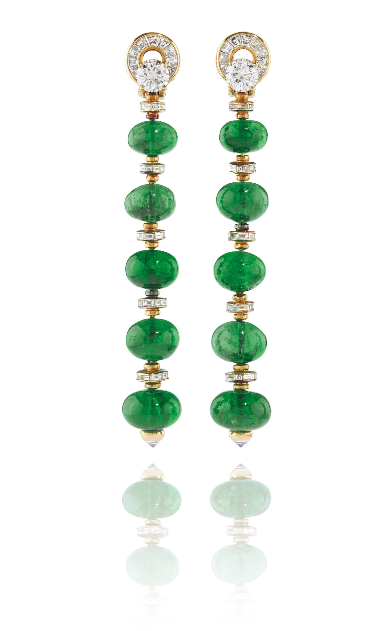 realizzati nella parte superiore con un cerchio in diamanti di taglio taples che racchiudono un diamante di taglio brillante da cui scendeno delle di sfere in smeraldo alternate a rondelle in diamanti di taglio baguette, punzone dell’oro e dell’orafo, firmati Bulgari, con certificato e astuccio peso gr. 20