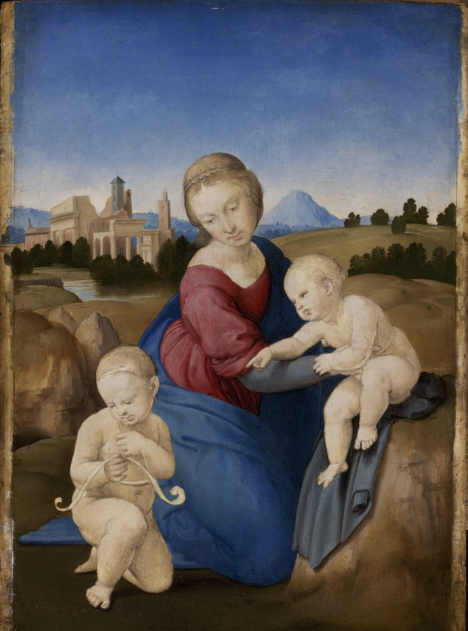 Il dipinto raffigura la Madonna col Bambino e san Giovannino e segna la conclusione del fondamentale periodo trascorso da Raffaello a Firenze, prima di essere chiamato a Roma da Papa Giulio II. La composizione di quest’opera si ispira in modo esplicito a Leonardo, conosciuto e attentamente studiato da Raffaello, che porta con sé la tavola nel trasferimento a Roma, luogo dove aggiunge, sullo sfondo, i ruderi del Foro Romano, dipinti con precisione topografica, a riprova di una conoscenza diretta e di una serena e convinta “immersione” nella classicità.