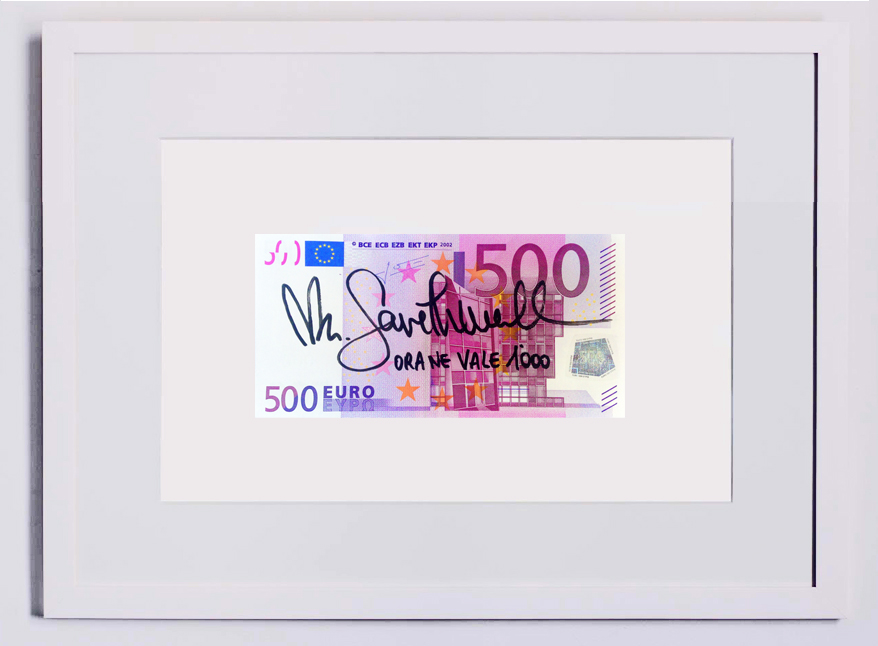 Un atteggiamento disincantato e ironico che viene condensato in “Midart”: una banconota da 500 euro autografata dall’artista sotto la frase “Ora ne vale 1000”. Una lettura quasi grottesca dei paradigmi su cui si fonda oggi il sistema dell’arte e degli affascinanti, ma anche inquietanti, meccanismi di attribuzione del valore “economico” di un’opera in rapporto al grado di notorietà raggiunto dal suo autore.
