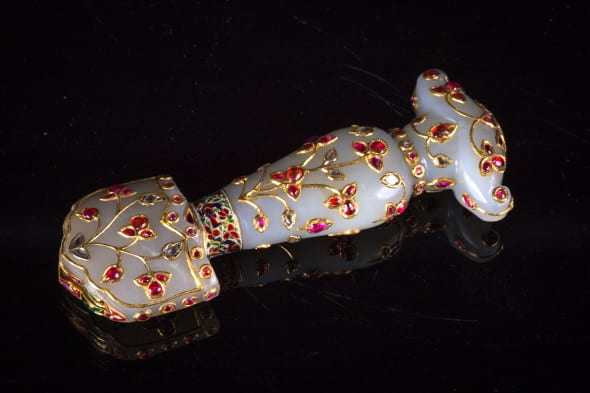 India, Moghul, XVII secolo Intaglio in giada celadon, intarsiata con la tecnica kundan ed incastonata con pietre preziose tra cui rubini e diamanti.