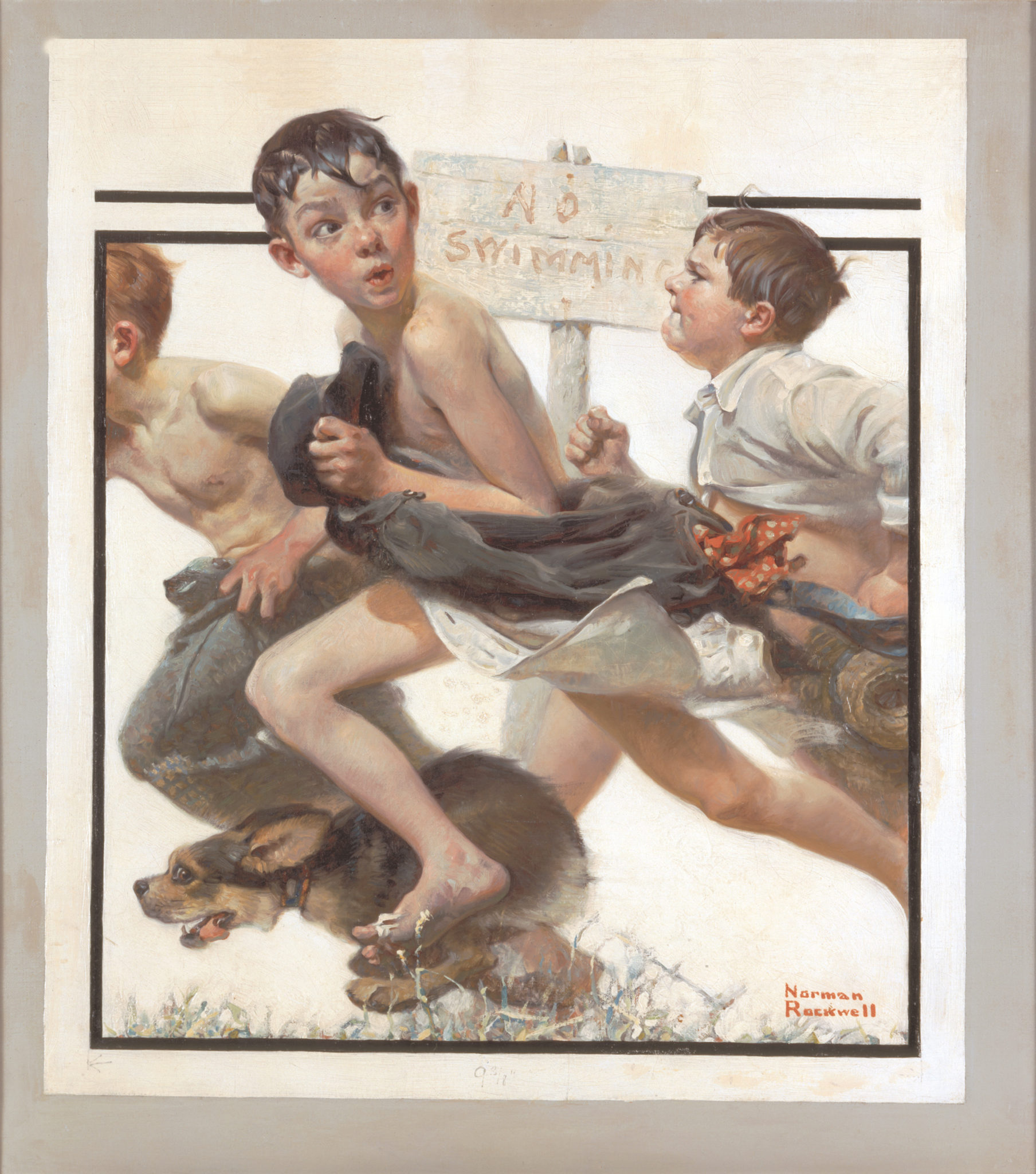 I bambini di Rockwell sono l’icona dell’America dream, dal monello che fugge in No swimming (Divieto di balneazione, 1921) all’eroico e giovane boyscout che trae in salvo una bambina dopo l’uragano in A Scout is helpful (Uno scout si rende utile, 1939). Era un ammiratore di Walt Disney, a lui donò un quadro, in mostra, con dedica: Girl Reading the Post (Ragazza che legge il Post, 1941), dove il volto della giovane è nascosto da quello di una donna fatale ed elegante di una copertina mentre sotto sbucano i calzini corti dell’adolescente.