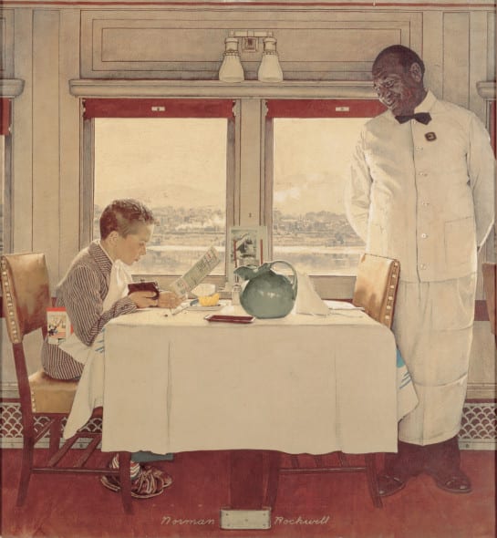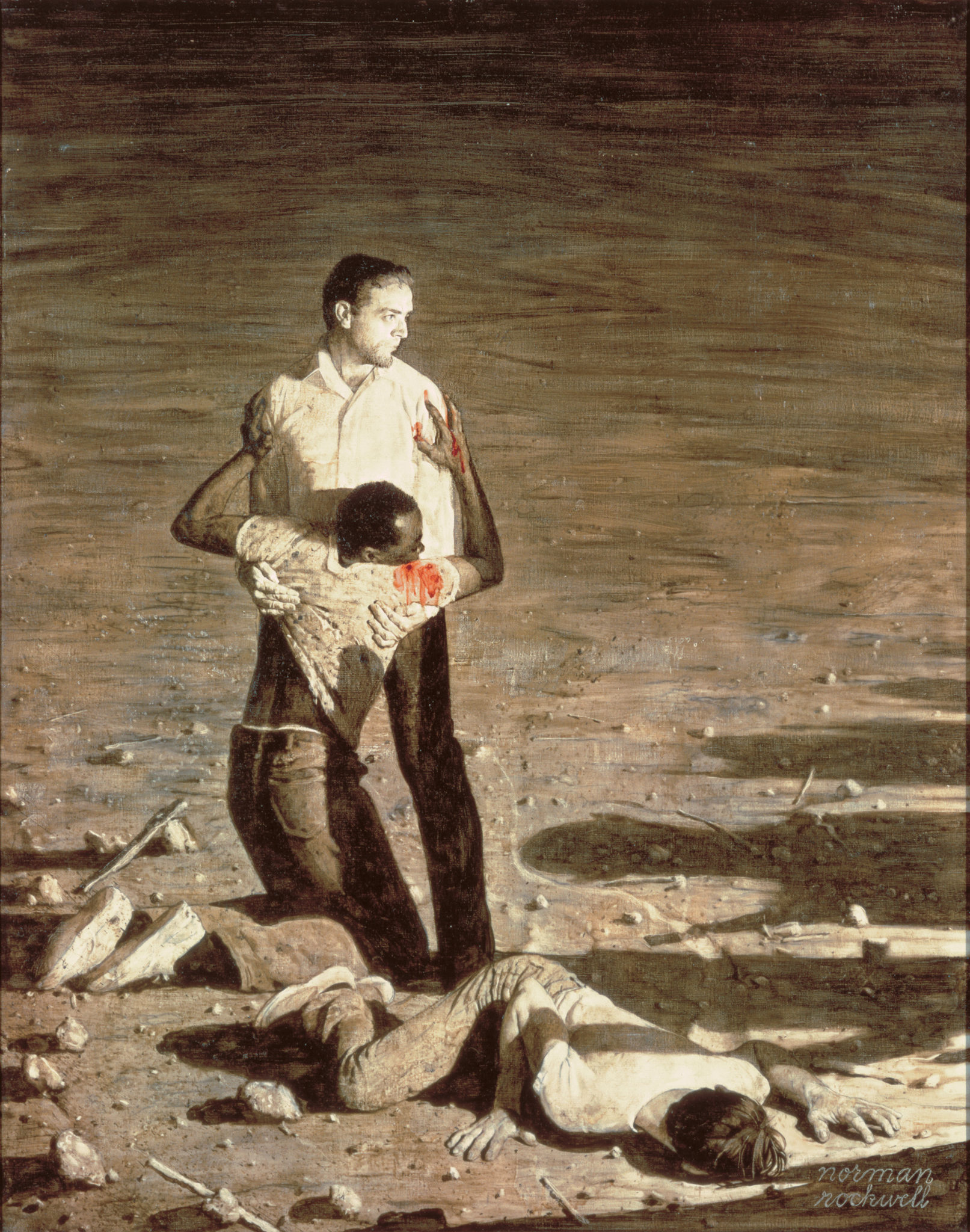 La tragedia dell’apartheid va oltre le microstorie rappresentate da Rockwell minuziosamente (“Le cose ordinarie non sono mai noiose”). The Problem We All Live With (Il problema con cui tutti noi conviviamo, illustrazione per ‘Look’, 1964) racconta il primo giorno di scuola di una bambina afroamericana, scortata dai federali per difendere il suo diritto all’istruzione, a cui tirano pomodori, il cui succo rosso sul muro (violenza) contrasta con il candore del suo abito bianco (innocenza).
