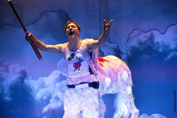 Ma Filippo autore sa come rischiarare l’ambiente austero della mente del Filippo in scena, una palestra-prigione, con gli elementi pop che da sempre contraddistinguono i suoi spettacoli. Palle da discoteca, fasci di luci, unicorni, pattini a rotelle, spezzoni di pubblicità degli anni ‘80 fluttuano nella stanza-mente del giovane protagonista senza ordine. O per lo meno, senza un ordine comprensibile ai nostri occhi. La bravura di Timi raggiunge l’apice nel dialogo tra Pinocchio e la Fatina-Lollobrigida. Un condensato di tragicità e ironia senza pari.