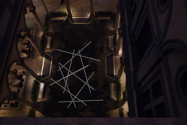 Una grande parete specchiante posta al centro del Cortile presenta sui due fronti la scritta “TU SEI QUÌ”, un’affermazione diretta e semplice che richiama le indicazioni sulle mappe dislocate nelle città o all’interno di edifici. A questa si unisce un diagramma a terra, disegnato da luci proiettate dall’alto, che rappresenta quasi una visualizzazione astratta e simbolica dei percorsi personali, delle scelte e degli accadimenti che popolano il nostro vissuto.