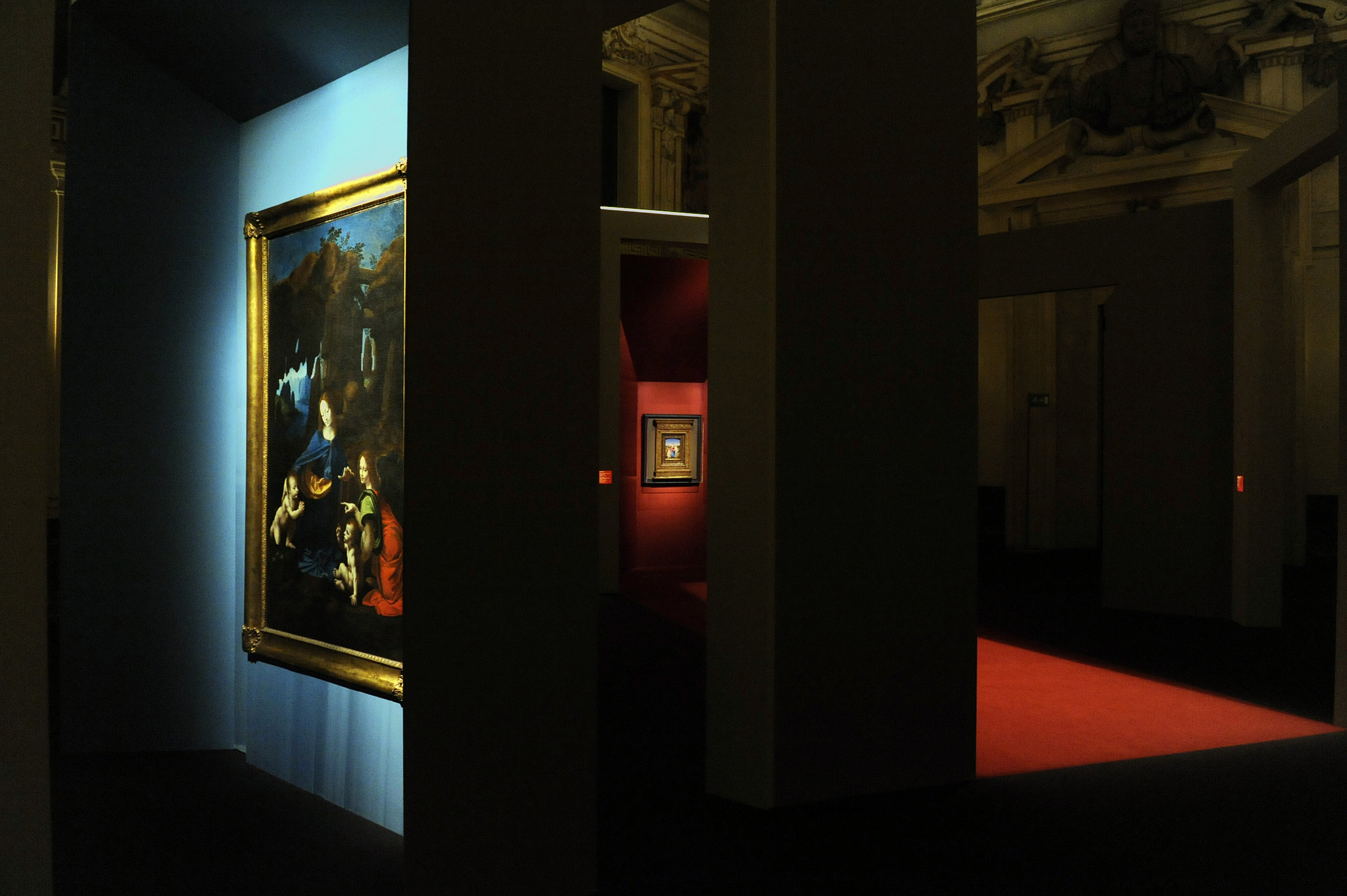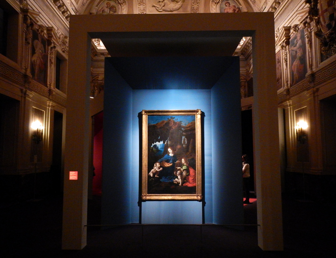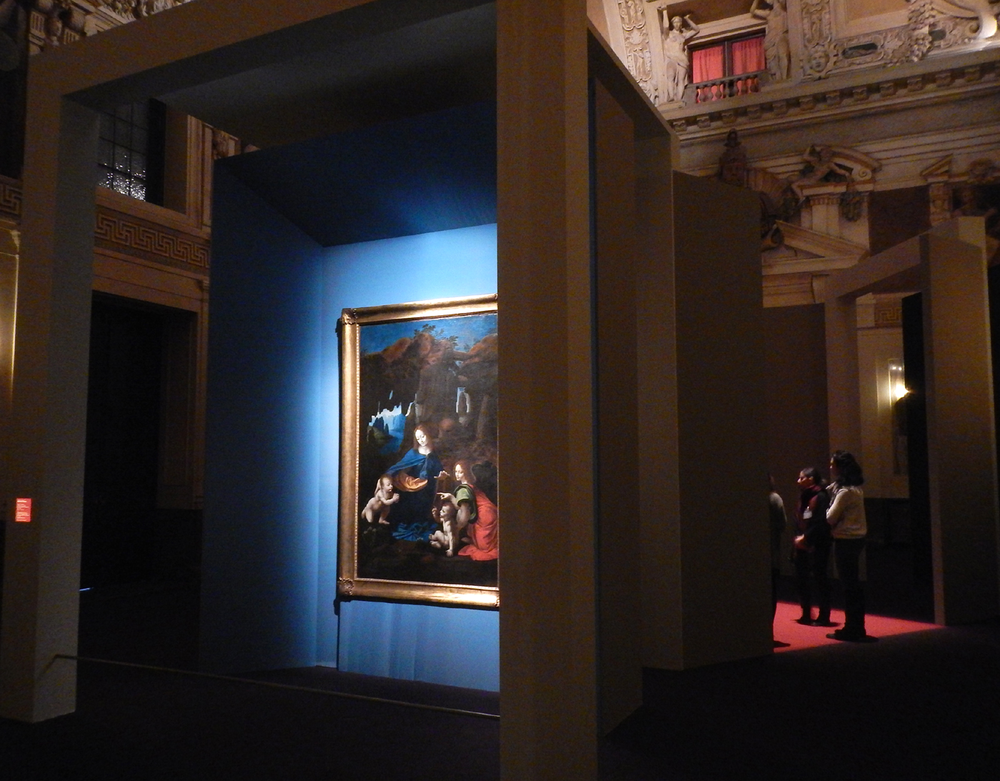Allestimento di cornici concentriche in Sala Alessi con tanto di portali architettonici ritagliati su misura: subito la “Vergine del Borghetto” incastonata nel blu; dietro le “rocce”, a destra: il “profumo” di rose del Bambino in braccio alla Madonna di Boltraffio.