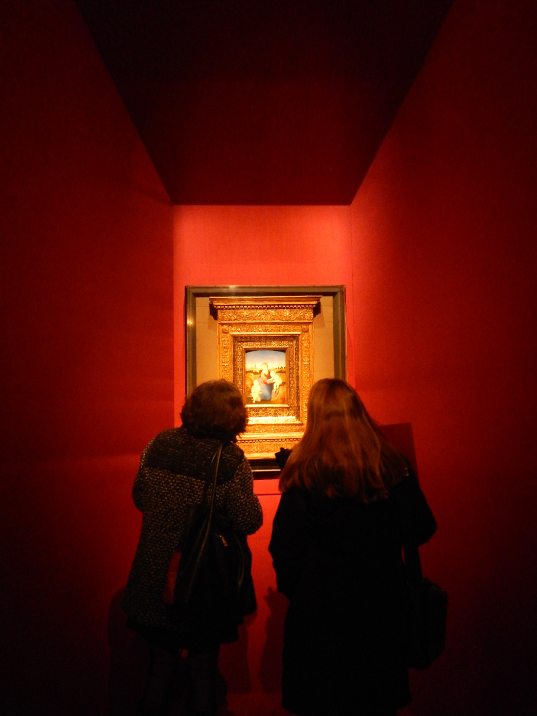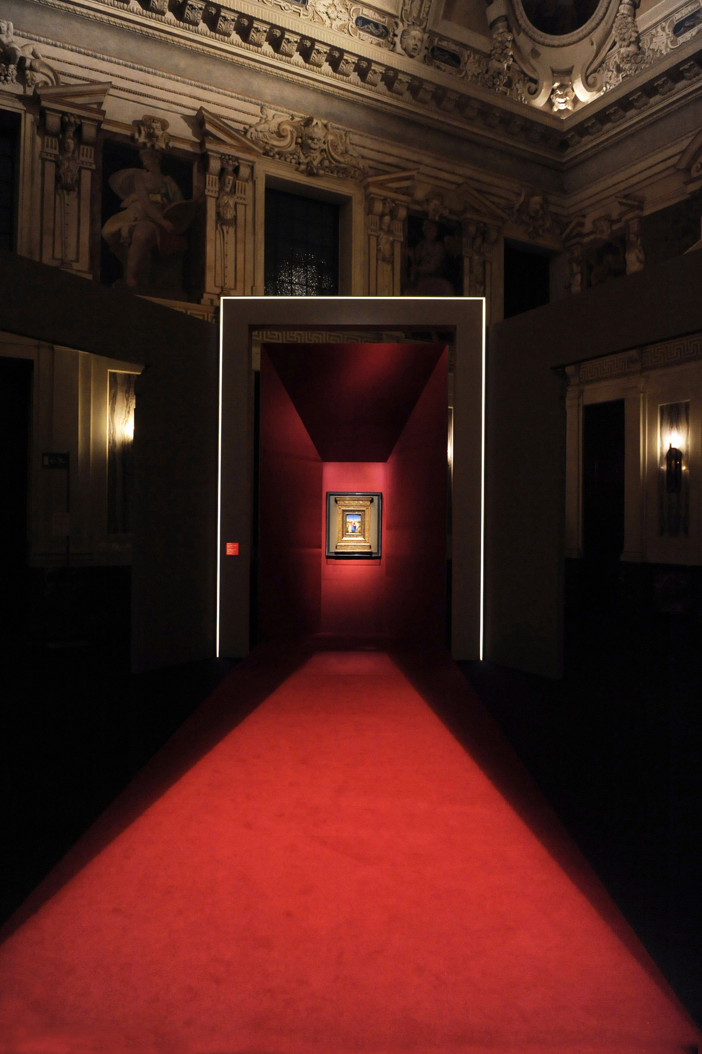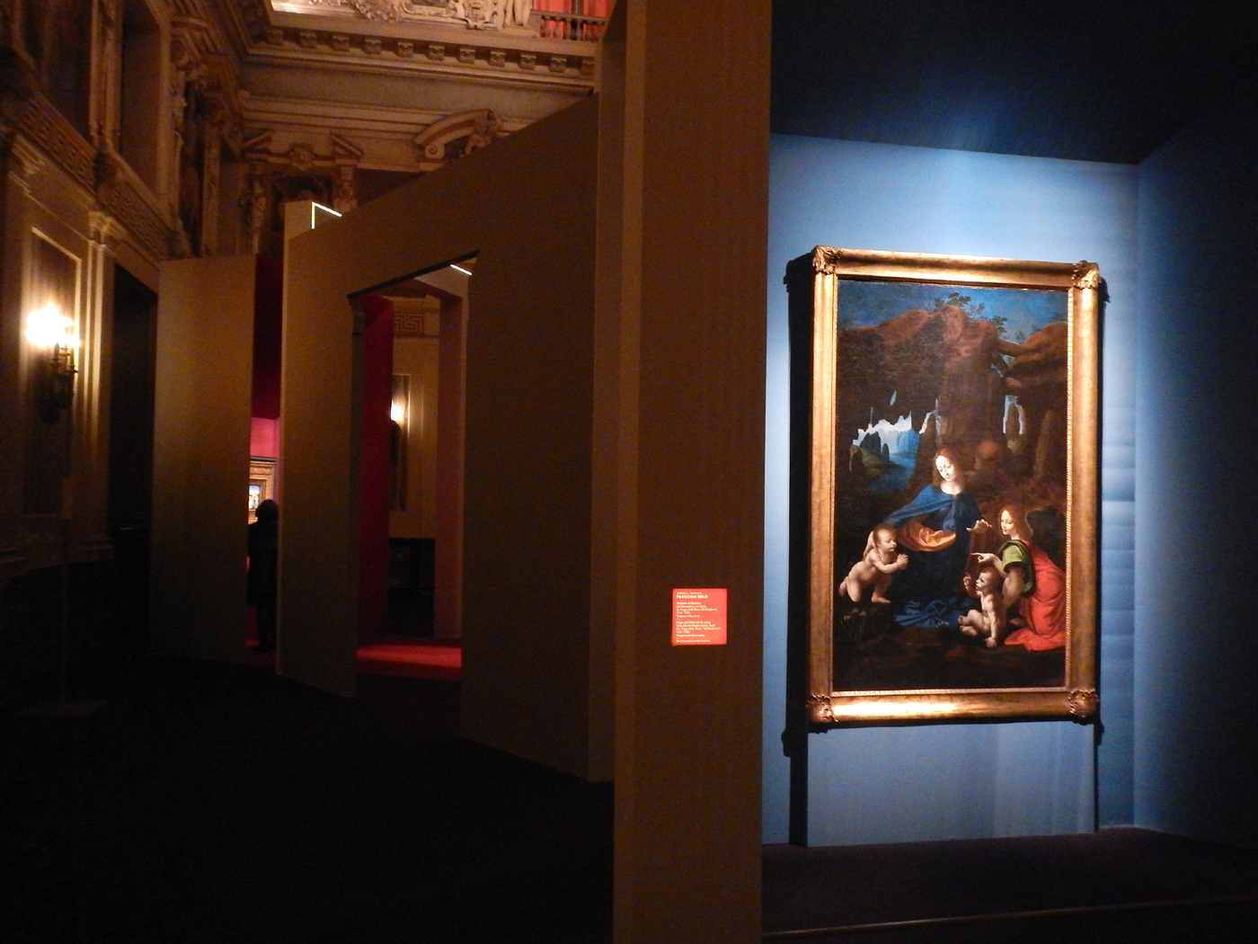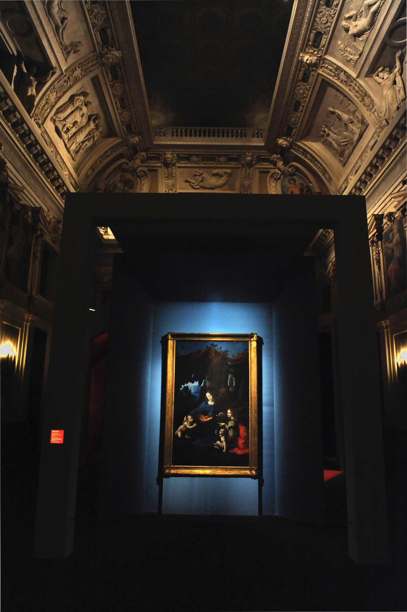 Allestimento di cornici concentriche in Sala Alessi con tanto di portali architettonici ritagliati su misura: subito la “Vergine del Borghetto” incastonata nel blu; dietro le “rocce”, a destra: il “profumo” di rose del Bambino in braccio alla Madonna di Boltraffio.