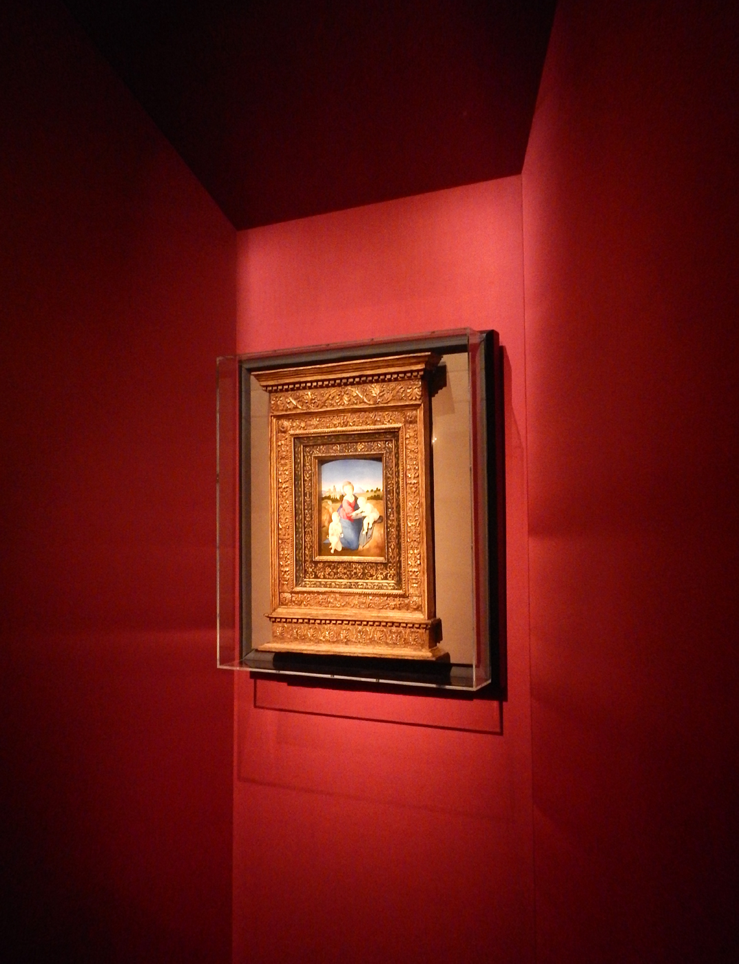 A sinistra: lei, la Madonna col Bambino e San Giovannino col cartiglio simmetrico tra le mani del “grazioso Raffaello Sanzio da Urbino” in trasferta speciale dal Museo di Belle Arti di Budapest.