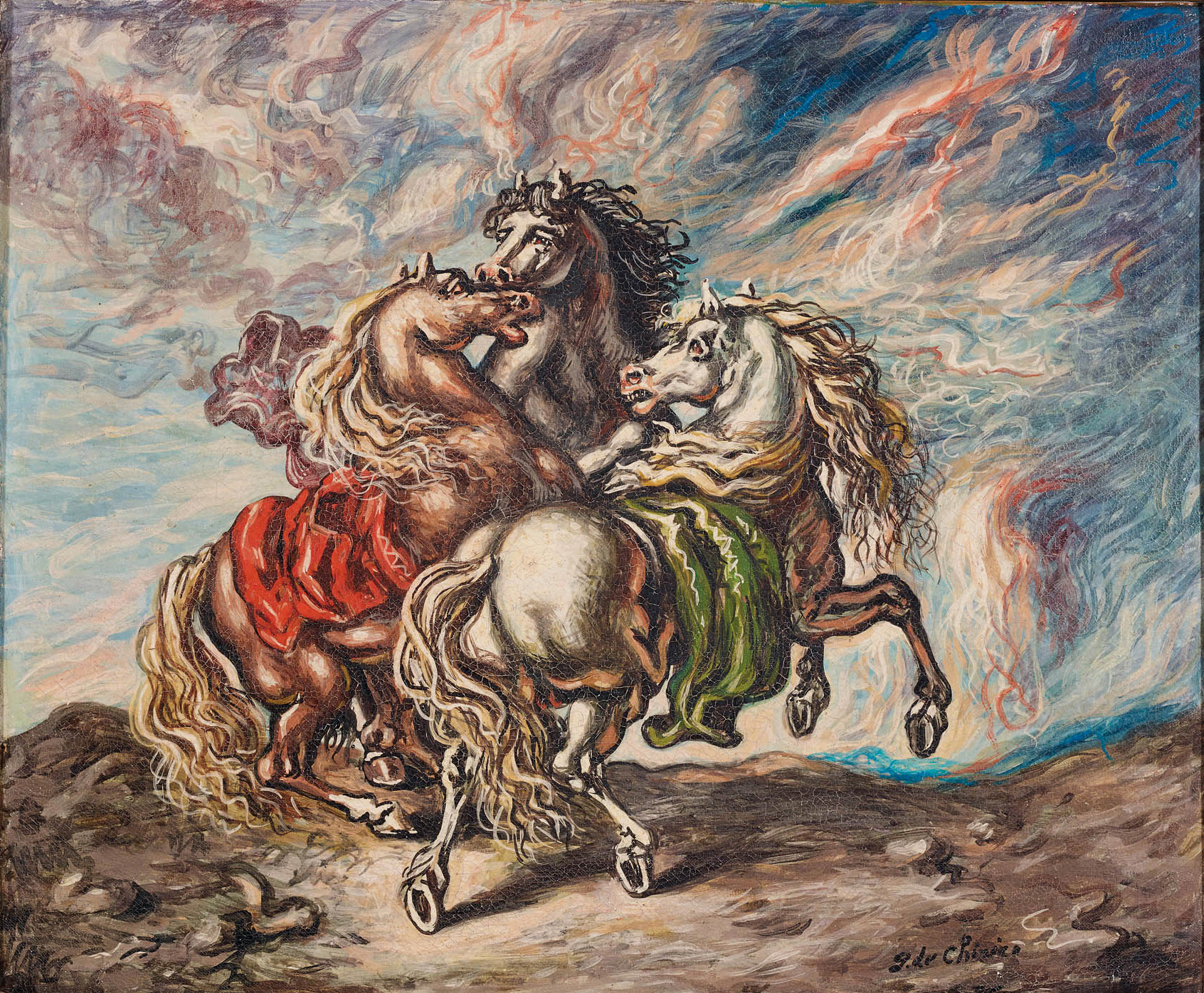 I cavalli sono il ricordo dell’infanzia, della fantasia e del mito, inteso come elegia del tempo perduto, di un enigma indecifrabile e struggente che induce alla riflessione introspettiva e misteriosa. Un tema che attraversa tutta la sua produzione, un esercizio di stile che con dinamico vigore si mostra nei Cavalli spaventati dalla folgore del 1960 (stima 40.000 – 60.000).