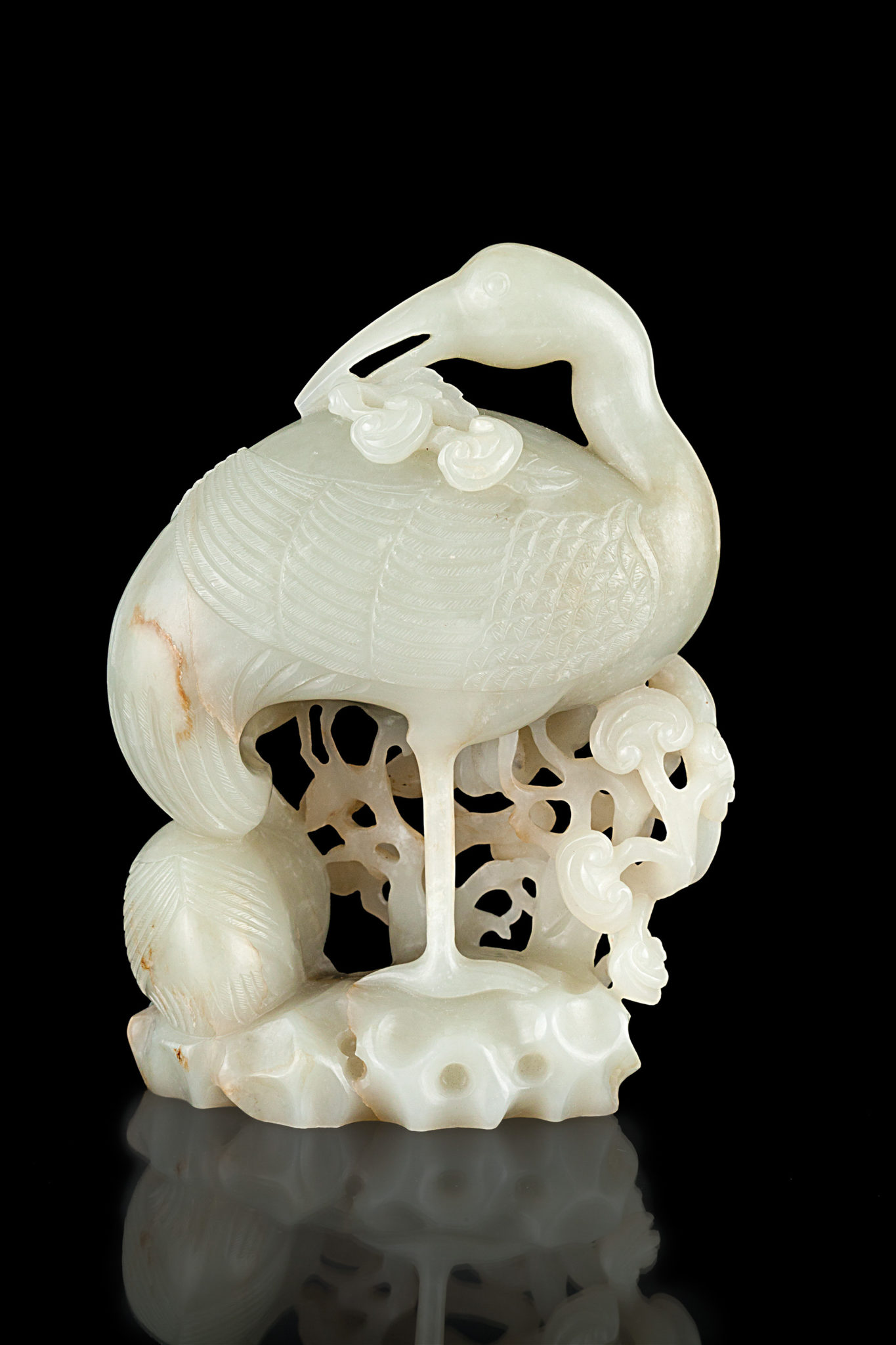 Le gru erano considerate anche coloro che trasportavano in Cielo le anime dei defunti, e raffigurate in volo nel cielo rappresentano elevazione sociale, così si può vedere in un’elegante giardiniera in porcellana del XIX secolo (lotto 79 stima 12.000 – 18.000 euro) e in una rara scultura in giada bianca, Dinastia Qing, periodo Qianlong (1736-1795) (lotto 88 stima 25.000 – 35.000 euro).