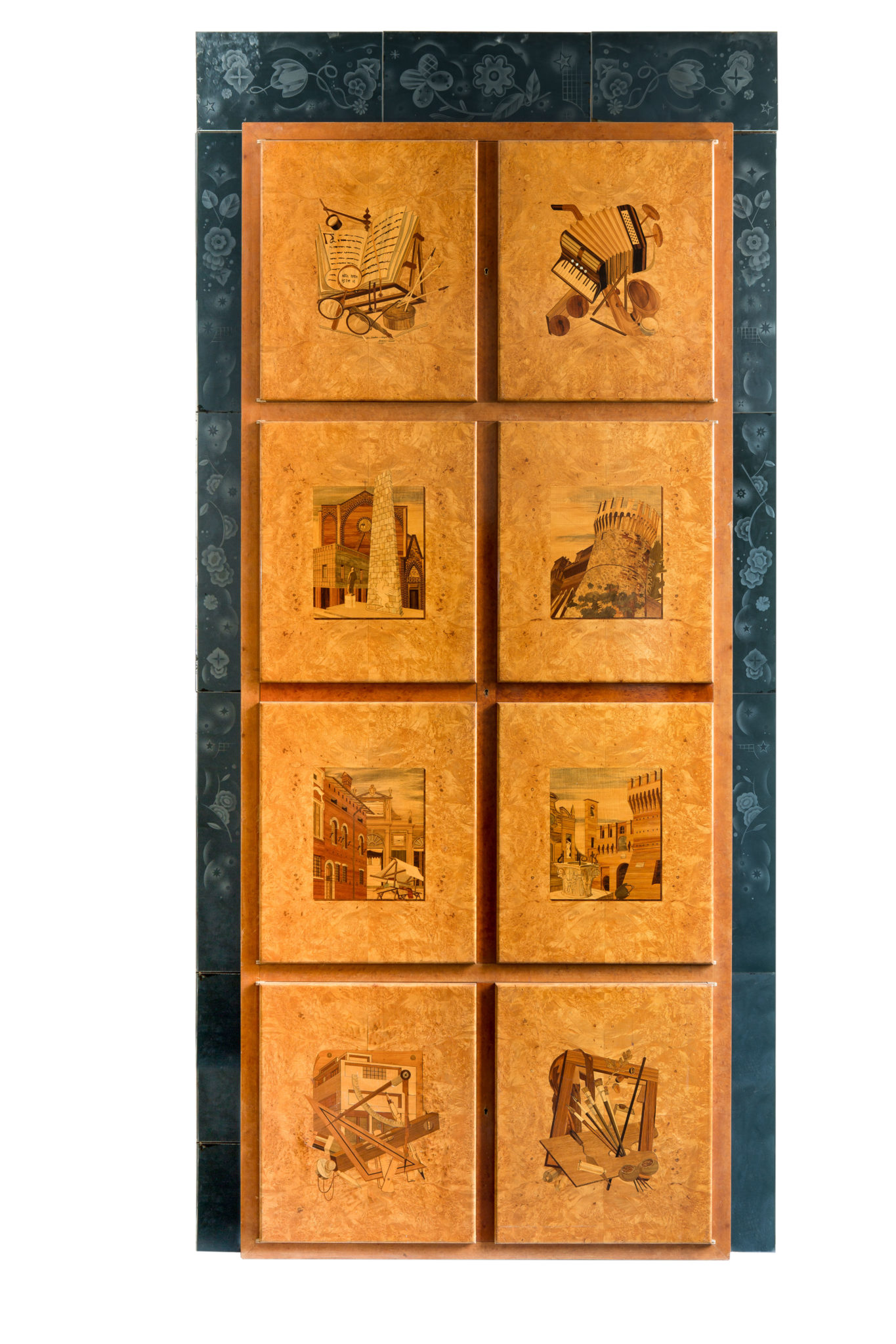 Il fronte di ogni sportello, rivestito in radica chiara a macchia aperta, è impreziosito da intarsi rappresentanti vedute ed allegorie. Di chiara ispirazione agli intarsi degli arredi lignei dell’Italia centro settentrionale rinascimentale, sono qui ripresi in chiave moderna.