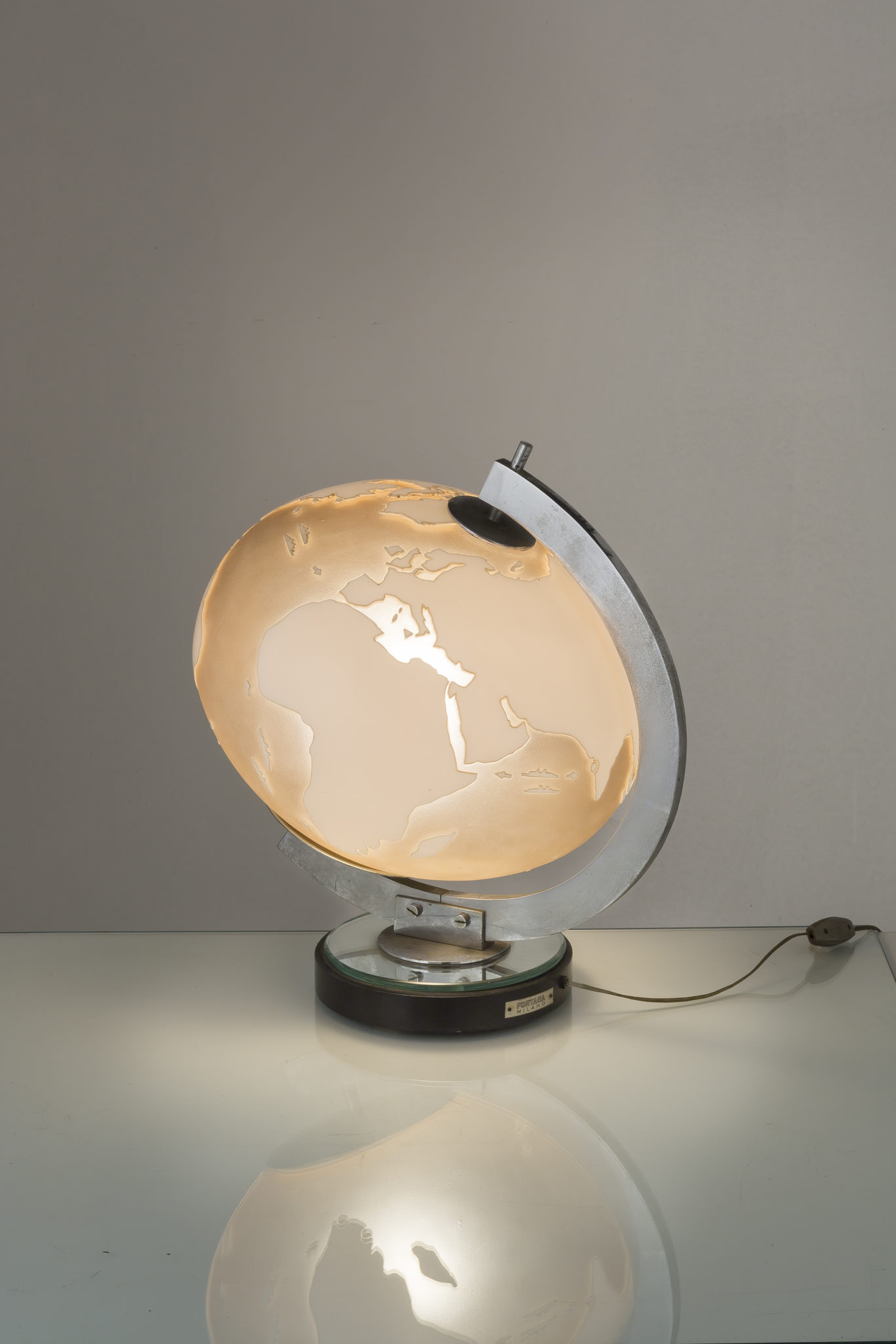 Antecedente di alcuni anni la splendida Lampada da tavolo in ottone nichelato, cristallo specchiato e vetro cammeo “Mappamondo” di Pietro Chiesa per Fontana Arte (stima 20.000 – 25.000 euro): nel 1935 le flotte riunite (Cosulich, Italia e Lloyd Triestino) commissionano all’azienda milanese una particolare lampada per le loro sedi di rappresentanza. Nasce così il Mappamondo disegnato da Pietro Chiesa, e sulla cui base vengono incisi i nomi delle tre compagnie.